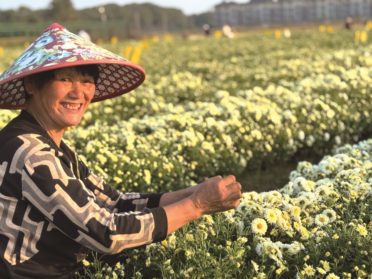 而现实中,杭白菊的植株很矮,人要蹲下来采。而且就像采茶一样,现实中的采茶工并不会像《采茶舞曲》里表演的一样,是一个个年轻漂亮、能歌善舞的姑娘。来采菊花的都是上了年纪的大妈们。她们或蹲或索性坐在田垄上,麻利地采摘菊花,动作熟练迅速。没多久,身旁的竹篮里就堆满了杭白菊。