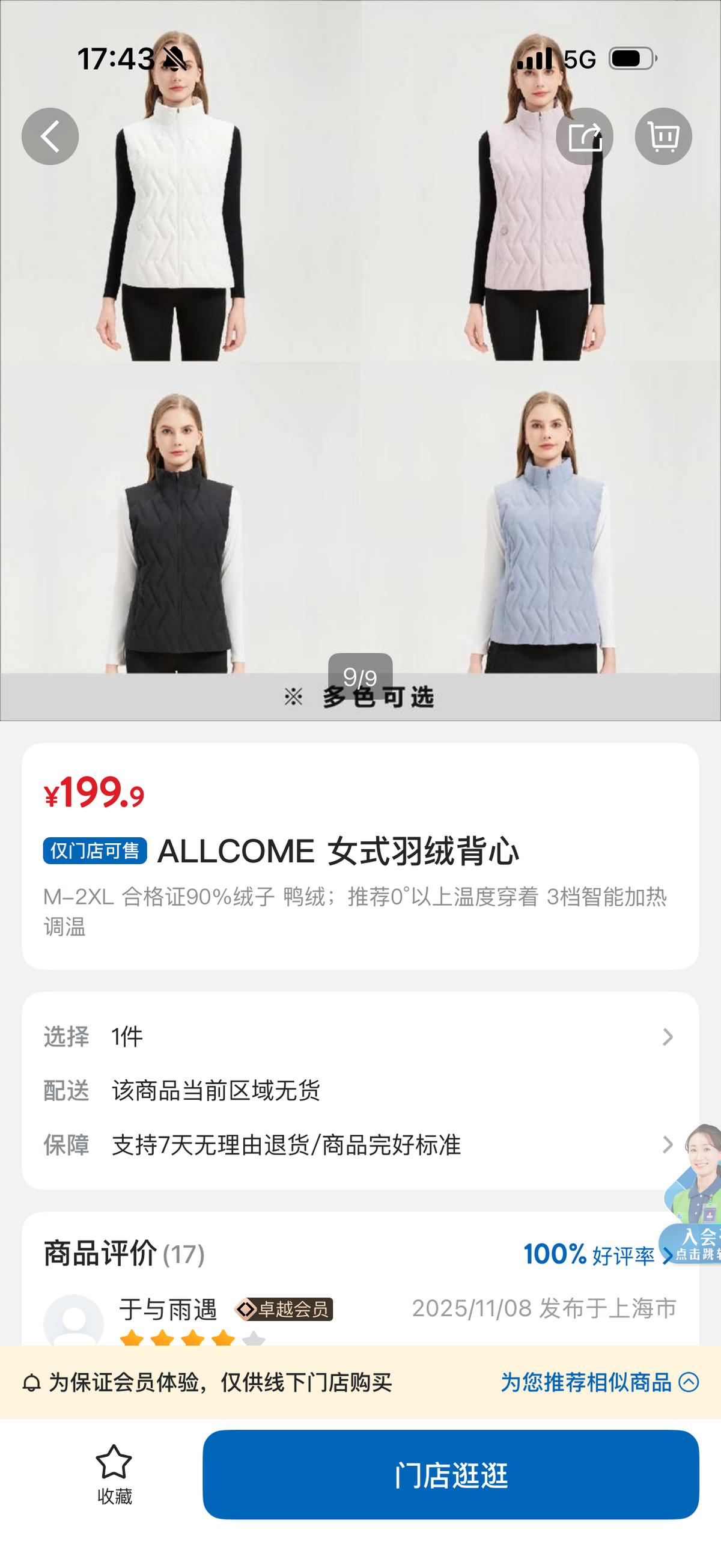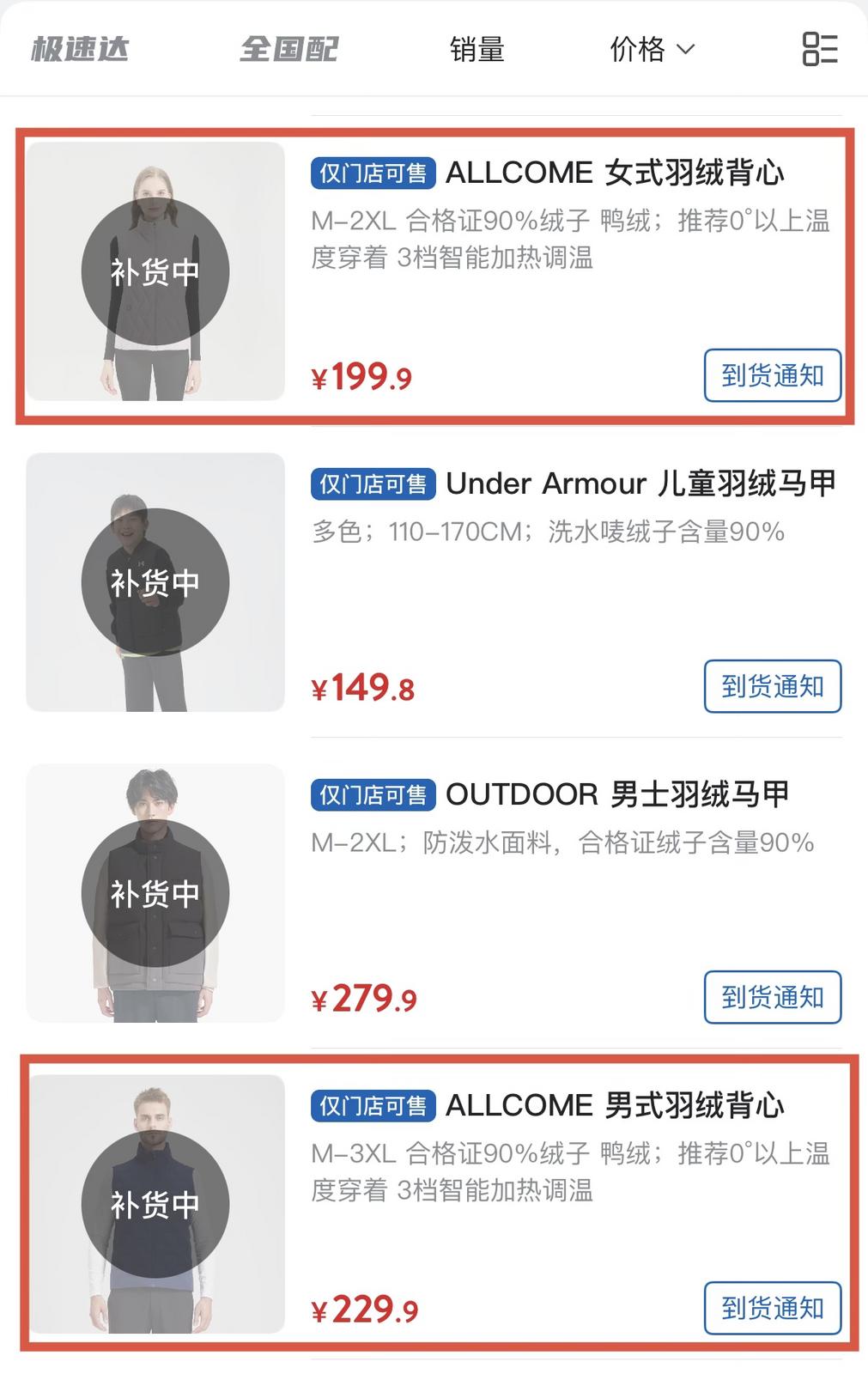记者在山姆APP查询发现,“加热款”羽绒背心分男女款式,男款一件标价229.9元,女款一件标价199.9元,并提供不同尺码、多种颜色选择。不过,南通地区目前均显示无货。