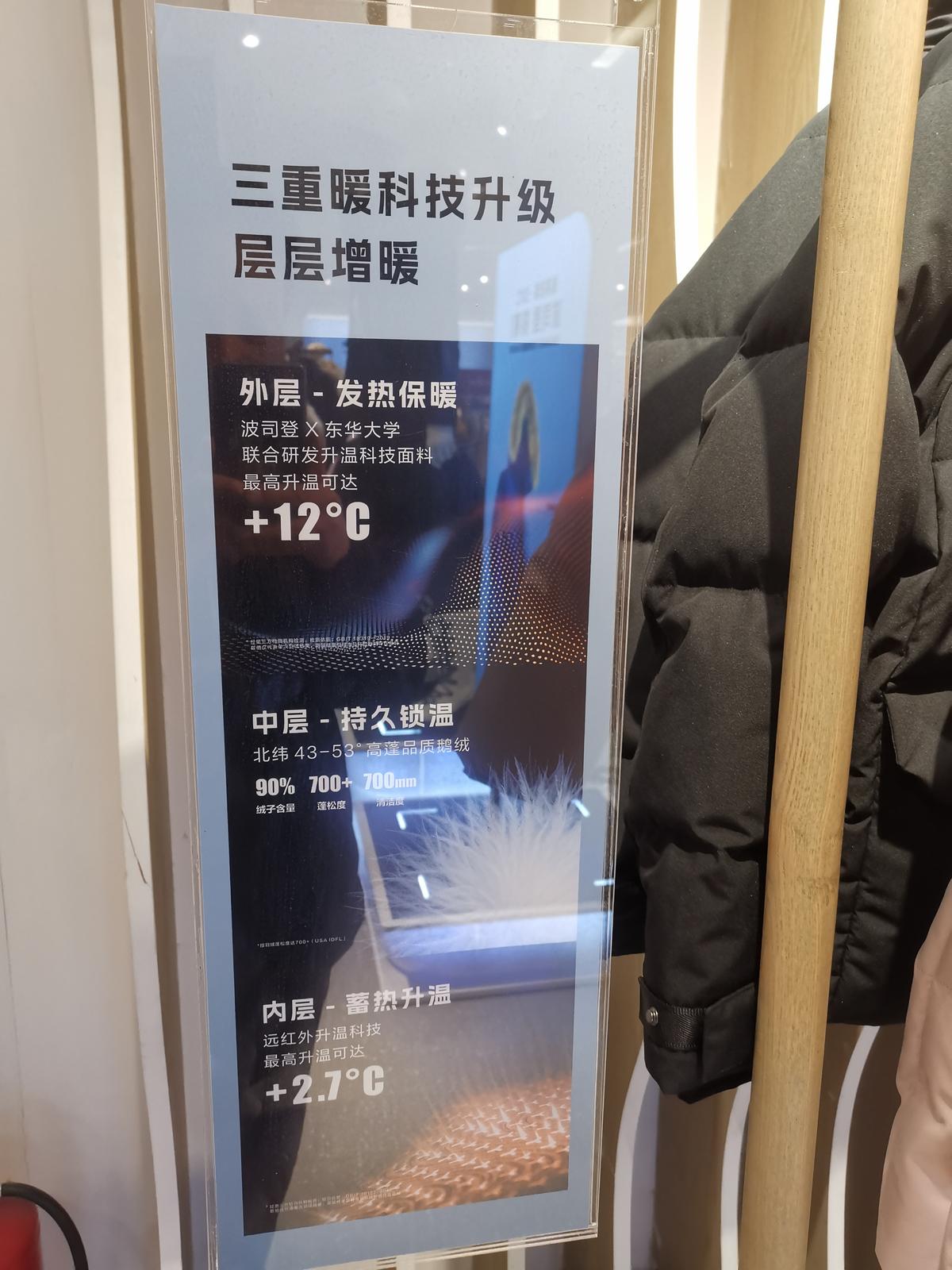 记者在现场细细打听后了解到,波司登具有自加热功能的羽绒服,主要集中在其“极寒系列”中,特别是第六代极寒系列。这款羽绒服采用了“智暖粒子”面料,能够吸收阳光并蓄热,从而实现升温效果。同时,该系列还结合了高蓬鹅绒、如700蓬鹅绒和蜂巢内胆等技术,进一步强化了其保暖性。
