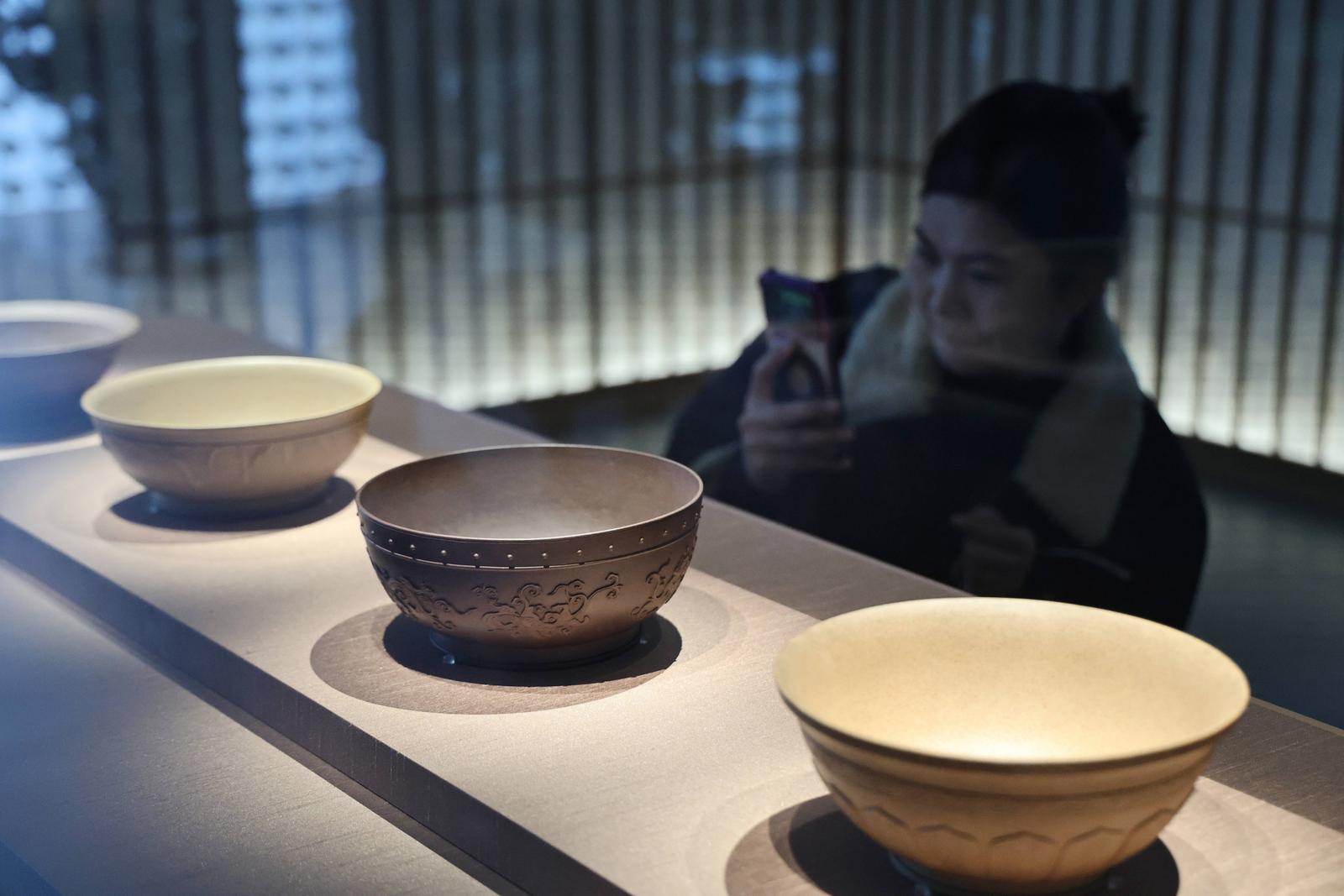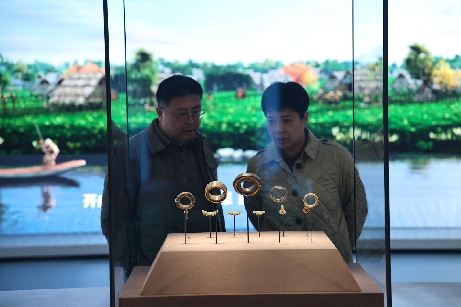 在主馆区,“江海潮涌”南通历史文化展通过近1200件文物标本,讲述了南通6000多年的文明史、1000多年的文明史,以及100多年的近现代史,呈现了从六千多年前青墩遗址出现的江海文明曙光,到张謇打造“中国近代第一城”的历史文化进程。其中,南通博物苑镇馆之宝“越窑青釉皮囊式壶”陈列其中,让观众一饱眼福。