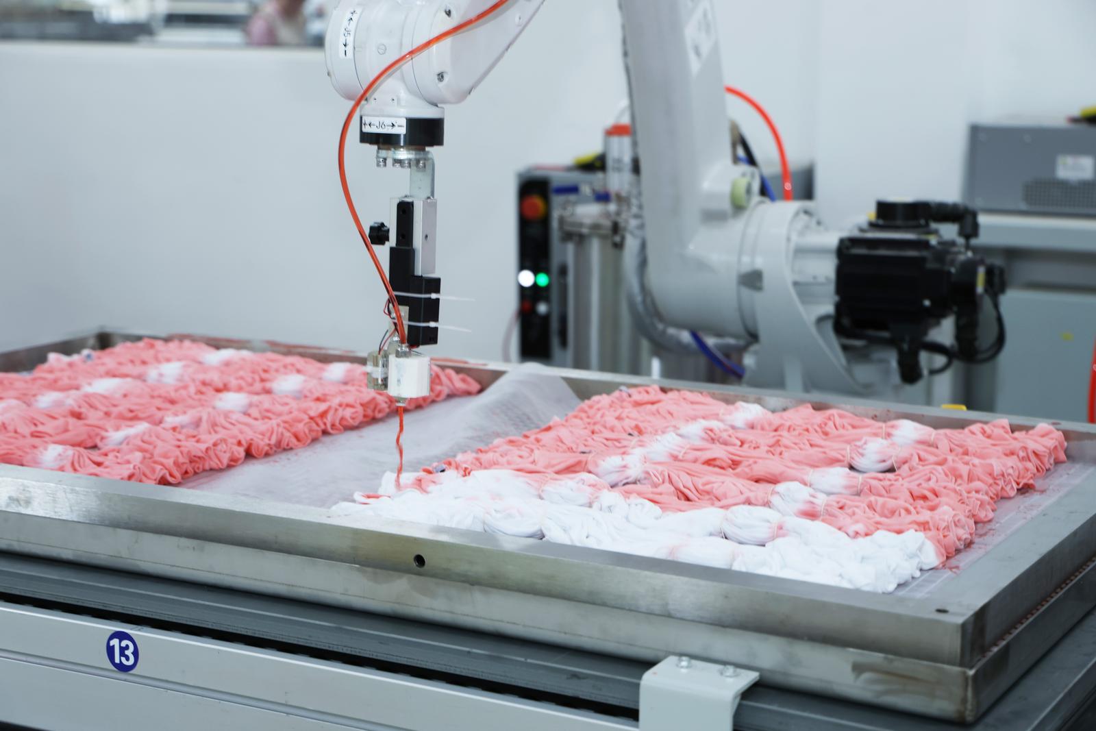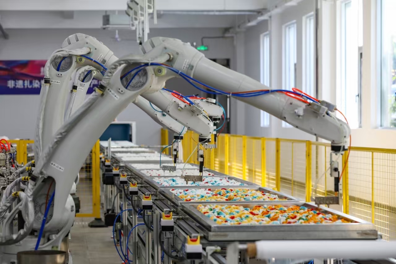 在华艺的智能车间里,古老的扎染技艺正与当代的算法代码相遇——四台机械臂在48米长的生产线上精准舞动,通过AI视觉动态校准,以毫米级精度复刻老师傅的染色手法。公司工业工程部经理马杭州介绍,这条与东华大学历时三年研发投产的中国首条AI智能扎染生产线,将生产效率提升了6倍,染料损耗降低30%,年产能达百万件,成为古老技艺嫁接现代产业脉搏的“心脏起搏器”。