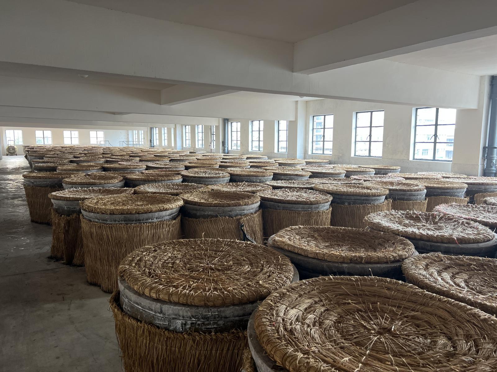 在南通白蒲黄酒有限公司酿造车间,单一层楼面就排布着800余口裹着棕黄色草编的发酵缸。这些草编是缸体的“保温层”,能在20天的发酵周期里,让原料透气“呼吸”。工作人员掀开一口缸盖,微温的米饭香混合着酒气瞬间蒸腾——这是流传了300余年的酿造技艺依然鲜活的证明。