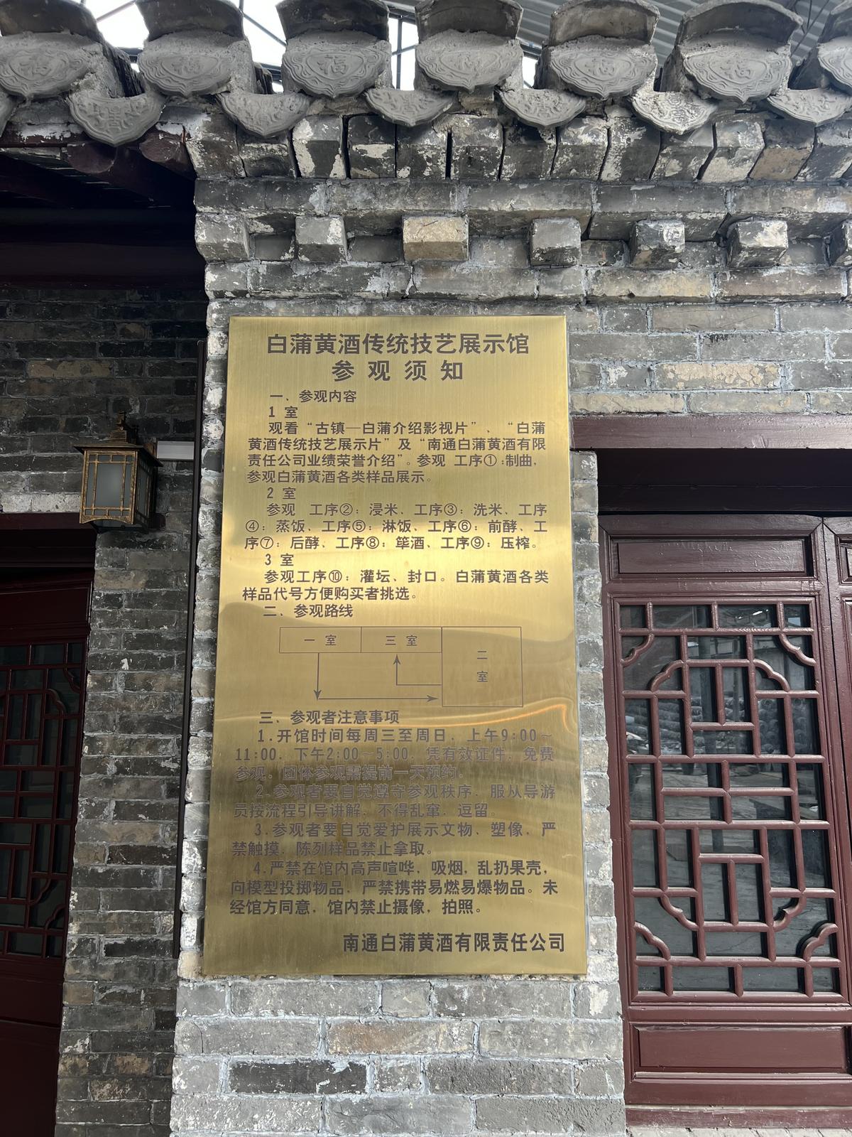 公司管理人员指着墙上张贴的生产工艺流程图介绍,白蒲黄酒酿造以粳米为原料,经浸米、蒸饭、淋饭等关键工序后,完成落缸搭窝、翻缸投水、喂饭等步骤,进入糖化发酵工序,还需开耙、后酵养醅;发酵完成后经压榨实现酒与酒糟分离,生酒再经澄清、煎酒,随后进入贮存环节,最终经勾兑、灌装后成为成品,每一步都体现出酿造工艺的规范性与专业性。