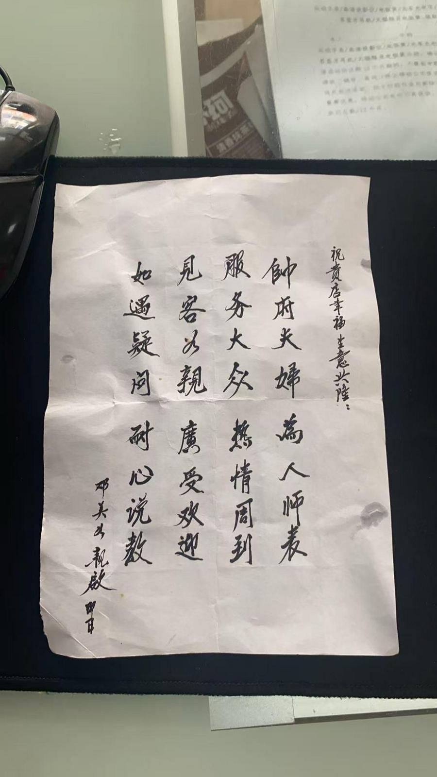 "帅府夫妇,为人师表,服务大众,热情周到……" 近日,通州区石港镇五窑金庄移动服务厅店主帅云飞收到一封特殊的感谢信。泛黄信纸上,八旬老人殷爷爷手书的32个字,道出了一家不足二十平米的小店十九年如一日服务乡邻的感人故事。