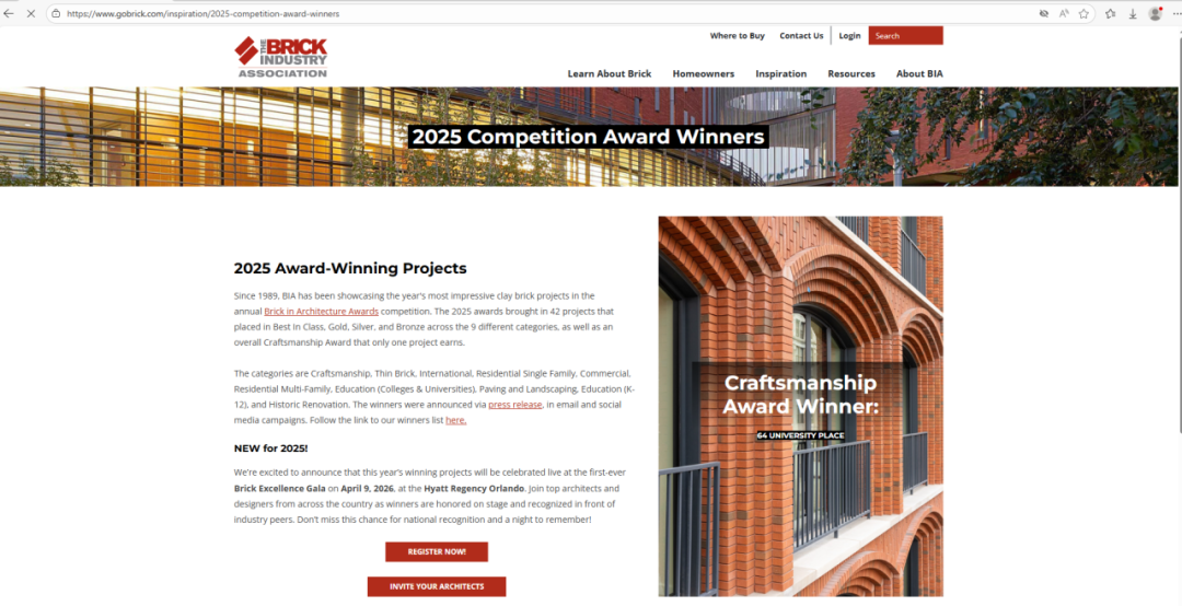 自1989年以来,美国制砖工业协会(BIA)每年主办一次全美最负盛名的砖建筑奖( Brick in Architecture Awards)评选活动。该竞赛旨在推广和表彰具有创新力,不寻常且有吸引力的使用粘土砖作为项目主要建筑材料的设计,提升公众对粘土砖创新设计的认可度。砖建筑奖已经成为美国最具权威和最顶尖的粘土砖建筑奖项。此次学院项目斩获银奖,不仅是国际建筑界对学院硬件设施设计的高度认可,更是对学院将建筑美学与精神传承深度融合的充分肯定。