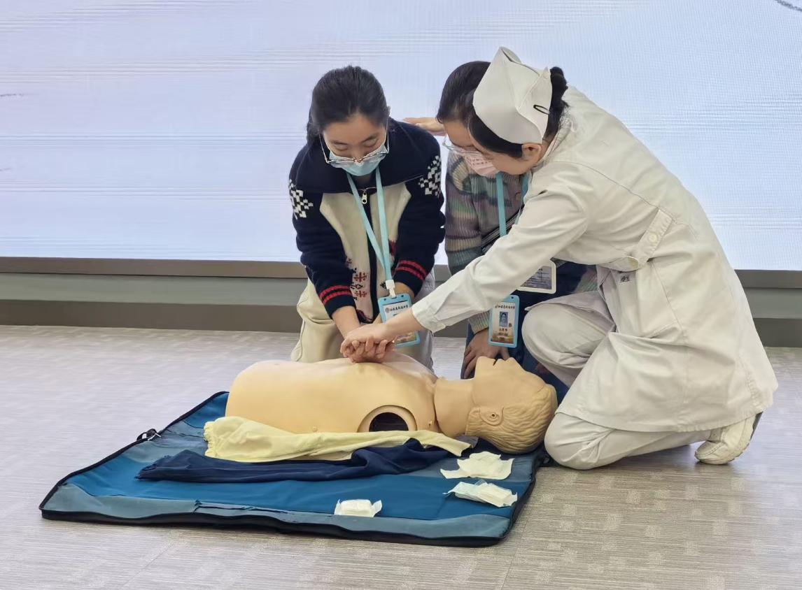 急救技能学习环节同样干货满满。儿科主管护师卢建丽聚焦心肺复苏与海姆立克急救法,先系统讲解核心理论知识,再结合模拟人教具进行规范操作演示,精准标注按压位置、控制力度、掌握频率及气道开放、异物排出等关键动作要领。理论讲解结束后,同学们热情高涨,纷纷上前动手实操,在医护人员的现场指导下,快速掌握急救技能的基本操作方法。