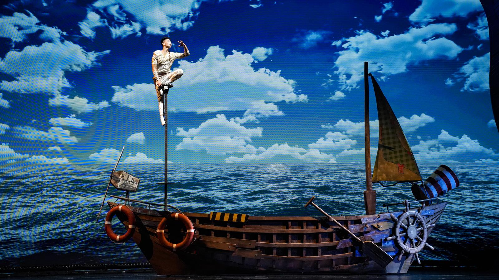 《蓝蓝大海上》节选《寻梦出海记——大海•小海》第六场片段,讲述少年“小海”立于波涛中的小船上,展示高难度《倒立》技巧,节目在保留原作品中“轿子”“飞机术”等精华技巧的基础上,新增高空“吊环”节目,寓意杂技团从现有成绩中孕育出新梦想,展翅飞向更高、更远处。
