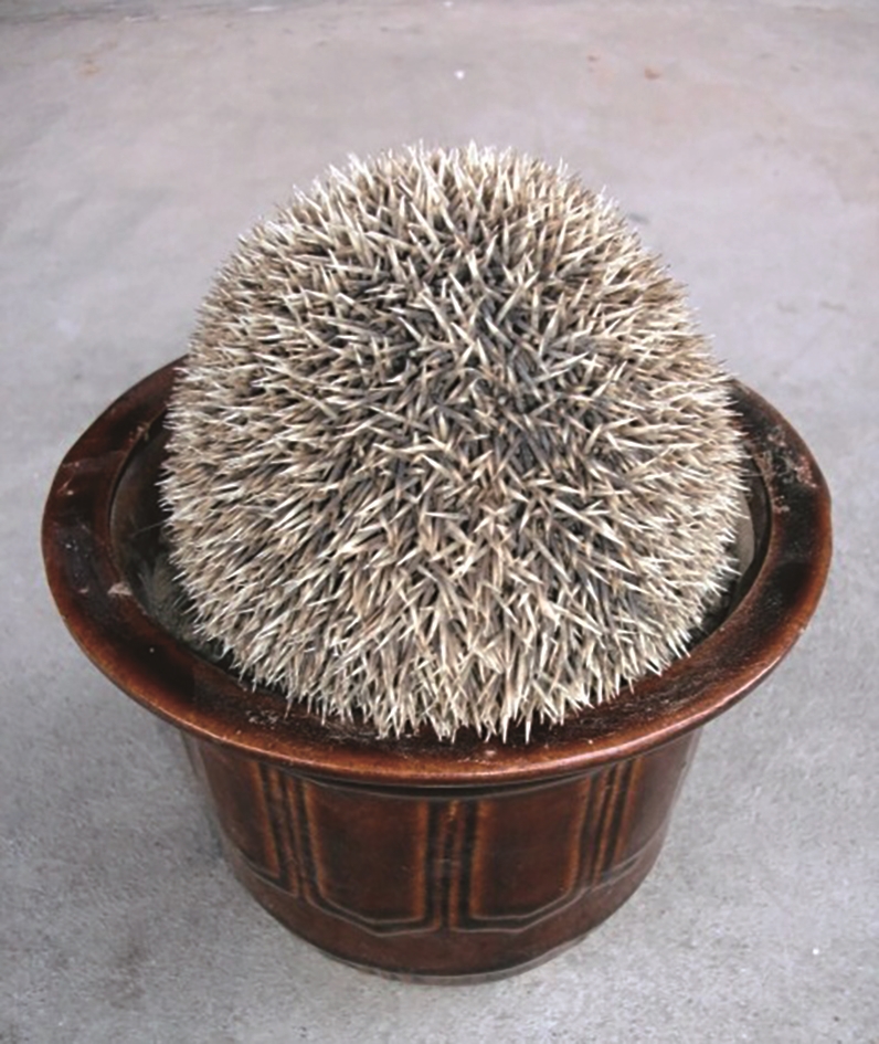 得到大家的一致同意后,我看着刺猬已缩成一个球形,于是脑洞大开,把一个花已枯萎、土还留着的花盆拿来,将刺猬放进花盆中央,刺猬就这样华丽转身变成一个创意盆栽,不知道的还以为花盆里养了一个新品种的仙人球。