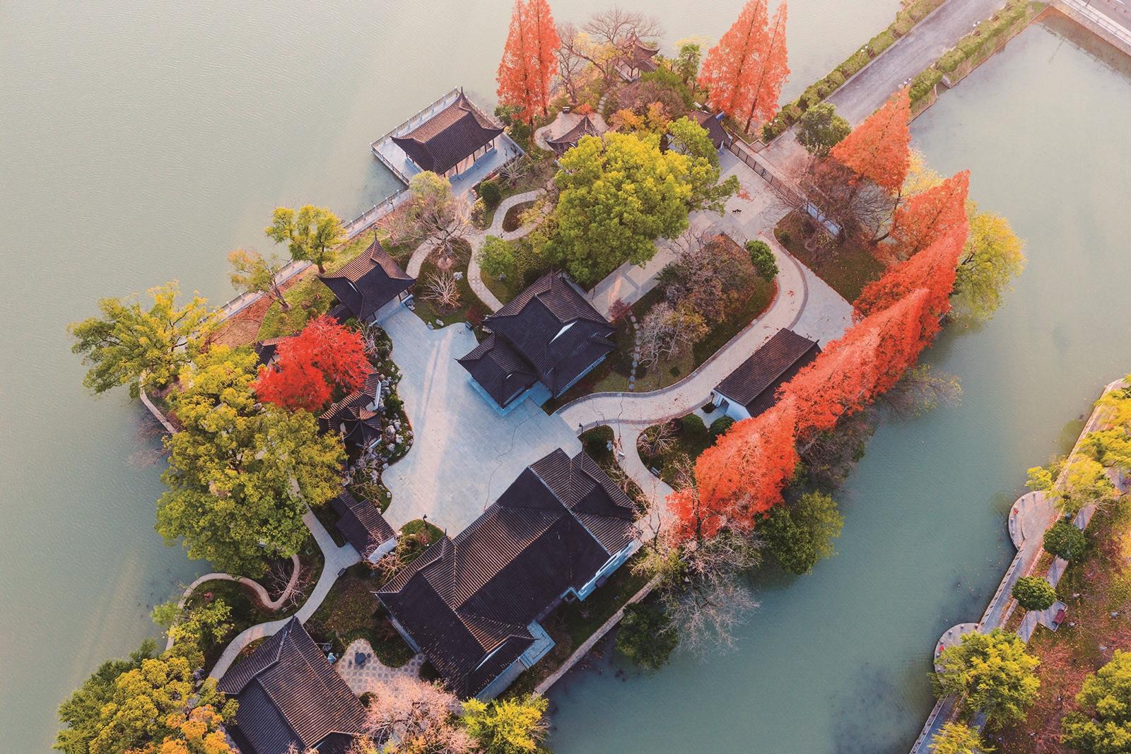 水边的落羽杉林定有天工的妙手,调和了从橘红、朱红到大红的斑斓色彩,漫染了一侧溪流。晴空辽阔地舒展开湛蓝的长练,横映在另一侧溪流。红蓝各半,相映成趣。