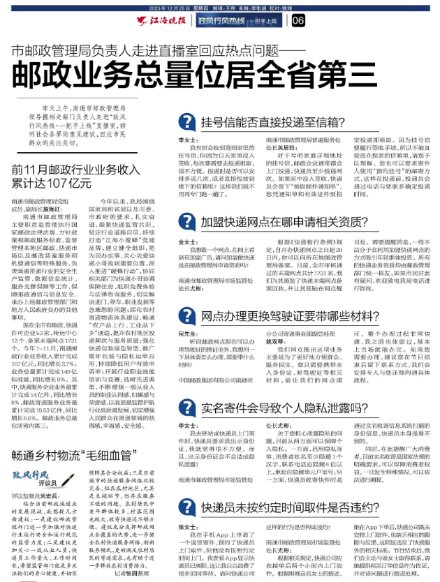 昨天上午,南通市邮政管理局领导携相关部门负责人走进“政风行风热线·一把手上线”直播室,倾听社会各界的意见建议,回应市民群众的关注关切。