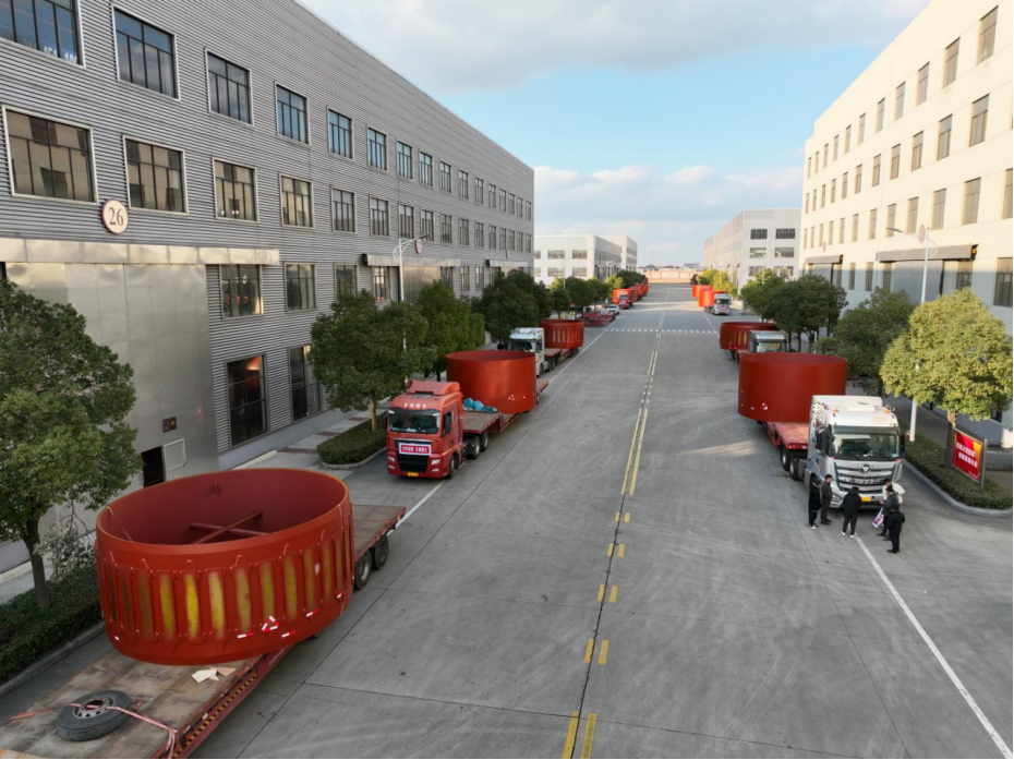 12月23日,在江苏鹏飞集团股份有限公司回转窑生产基地,3台套Φ5.2×98m锂矿回转窑正装车完毕,即将发往四川项目现场。
