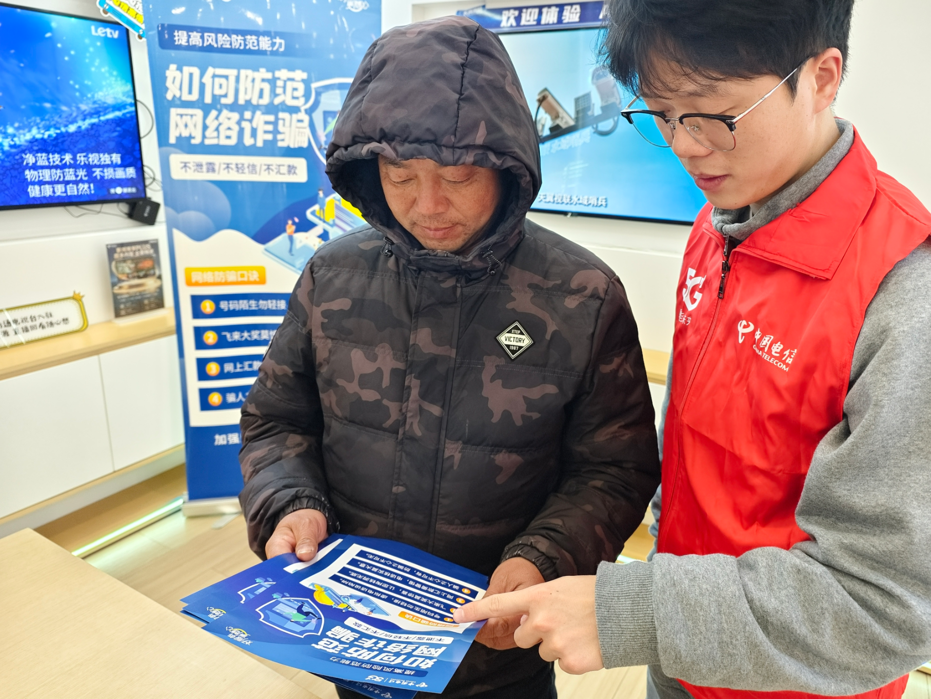 走进南通电信的体验专区,没有枯燥的宣讲,只有坐下来就能学的 “实用干货”:工作人员拿着图文并茂的手册,把 “十个凡是” 反诈口诀拆成易懂的生活场景;手机上的反诈功能,从下载到开启,一步一步带着操作;连电视屏幕上,都在循环播放着 “不透露、不轻信、不汇款” 的防骗提醒。