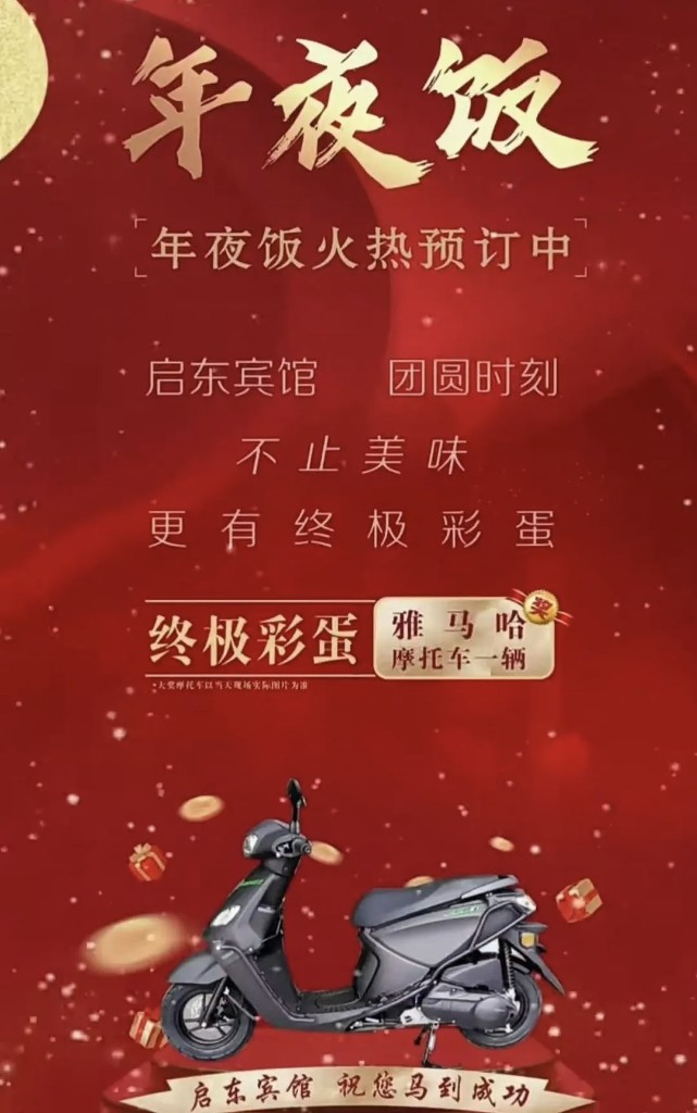 而启东宾馆的年夜饭套餐更是没有预热直接爆单。鉴于年夜饭的订单量,启东宾馆目前推出的是8个冷菜12个热菜的标准菜单,适合10个人的用餐量。“差不多人均400元~500元的标准。”曹卫介绍,“届时我们这边还会有表演和抽奖,大奖是一台价值7000元的摩托车。”