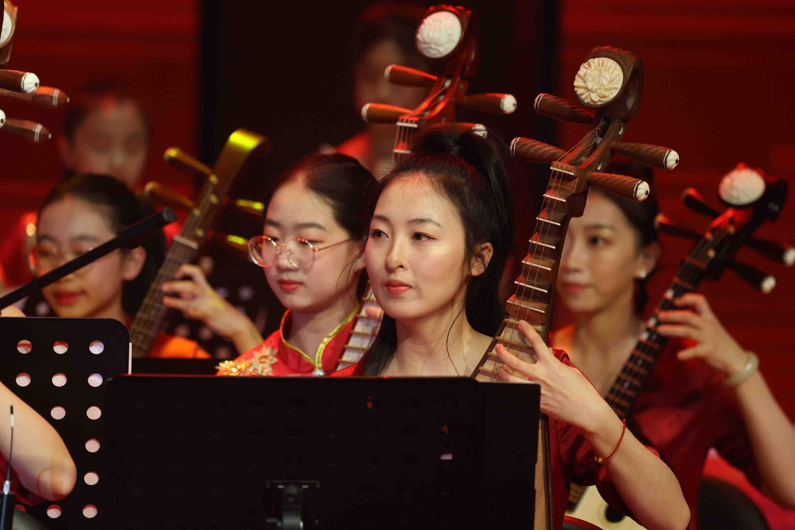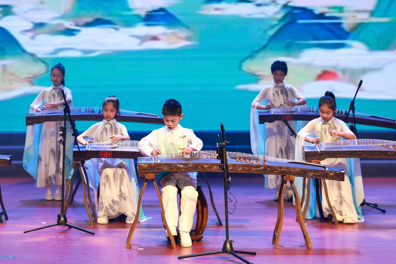 音乐会在小主持人清脆的开场词中拉开帷幕。率先登场的是低年级“豆豆团”,他们带来的《凤阳花鼓》瞬间点燃全场热情。随后,温暖的小组唱《你从光中走来》用清澈童声诉说师生间的真挚情谊;琵琶合奏《忆江南》带领观众步入烟雨朦胧的诗意画卷;陶笛社团带来的《童趣笛音》仿佛邀人步入奇妙的童真世界;越剧社团一曲《长安三万里》,以柔美的江南清音对话磅礴的盛唐气象;儿童舞蹈《叫我小娜扎》将观众带往美丽新疆,绘就一幅绚丽的民族风情画……