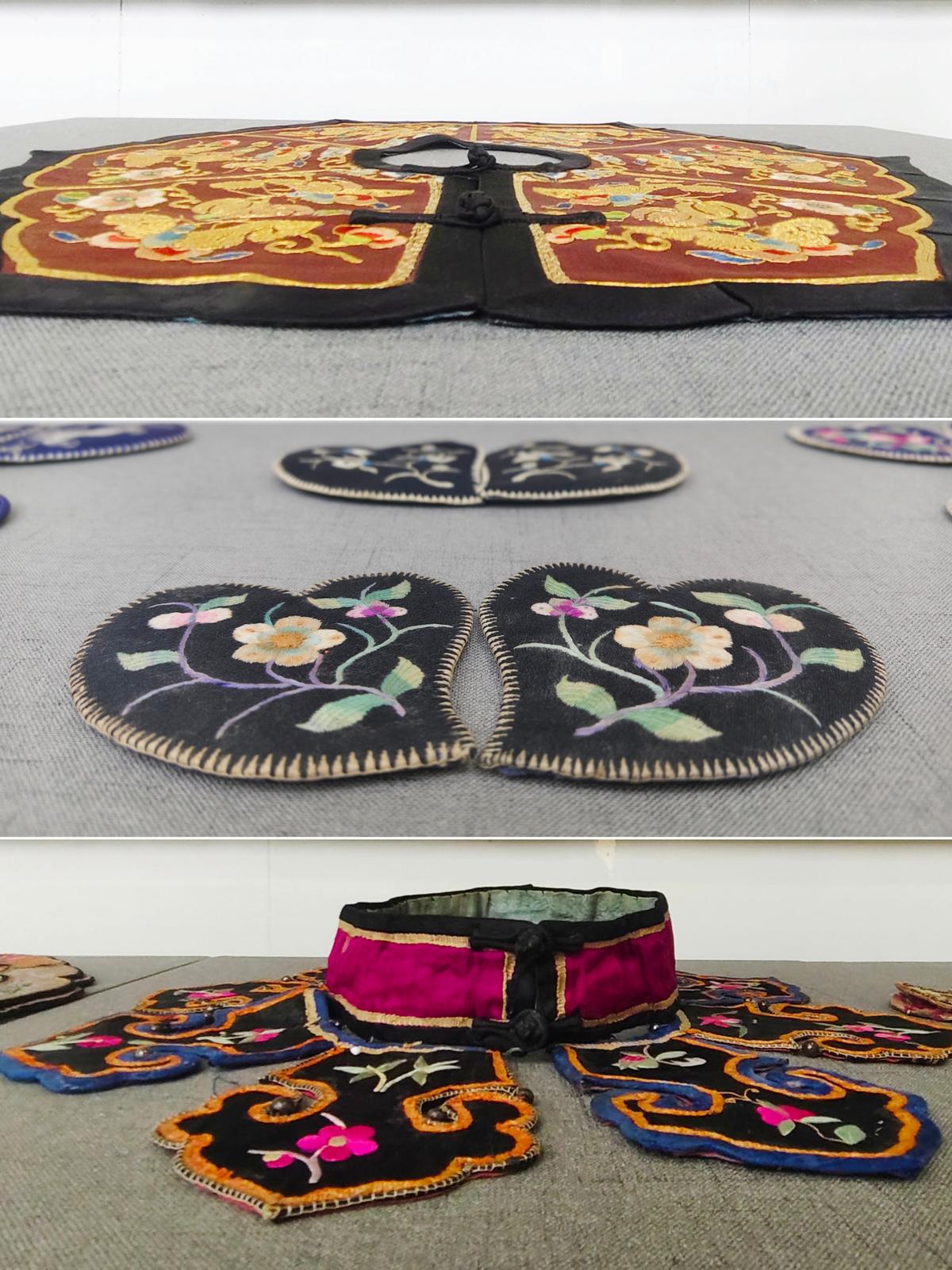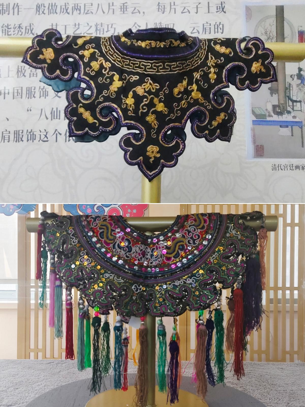 现场的展品从清代绣纹繁复、用料考究的精致风,到民国简约雅致、中西融合的革新风,从宫廷服饰的华贵大气,到民间服饰的质朴清新,每一件展品都承载着特定时代的文化印记。展览不仅陈列了眉勒、暖耳、云肩等特色服饰品,更通过工艺解析、场景还原等方式,让观众深入感受清代和民国时期工艺的精巧,既能读懂服饰纹样中的吉祥寓意、材质里的地域特色,也能体会藏于细节中的文化温度。其中,眉勒作为传统妇女首服,清代兼具防寒束发功能,民国融入简约线条更显温婉;暖耳作为防寒工具,清代用皮毛镶边御寒,民国添绣线纹样兼顾实用与美感;云肩则从最初保护领口肩部,演变为彩锦绣制的装饰织物,纹样如霞似虹,尽显传统美学。