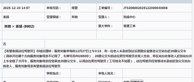 12月31日,南通公交开发区公司工作人员收到一份来自12345政务服务热线转来的表扬工单,工作人员在核实时,一个熟悉的名字再次浮现——20路班组长李建军。工单中,市民深情诉说了其母亲的一段温暖经历,而这份认可,正是对李建军数日前一个善举的回响。