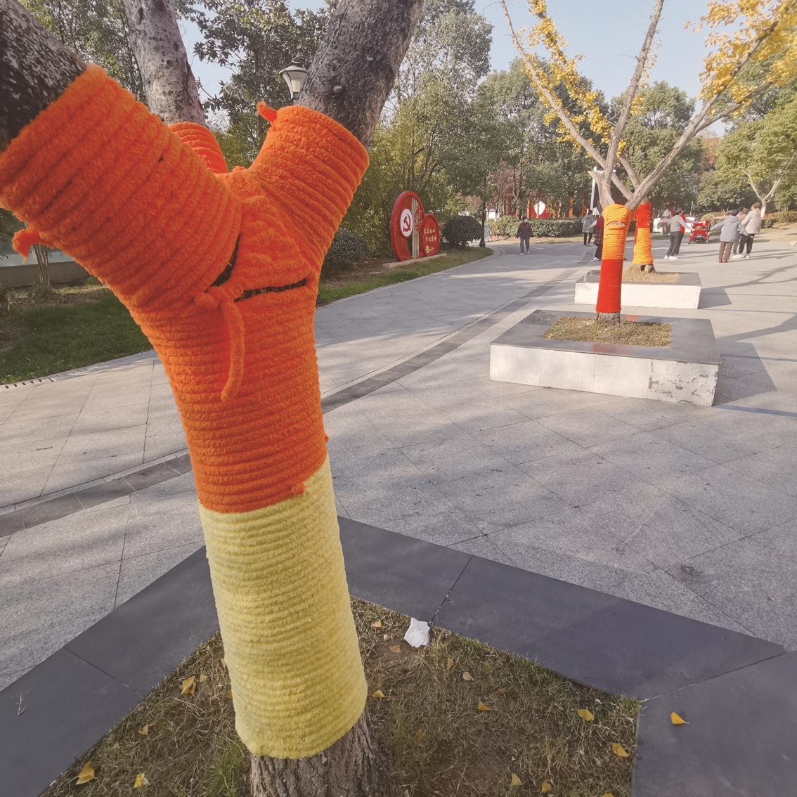 那彩衣竟不是画上去的,是用五颜六色的毛线从树根开始,一圈一圈缠绕上去的。再看这跳脱的颜色,有绛紫、大红相接,有橙红、菊黄相间,煞是养眼,萌萌暖意扮美初冬景象。