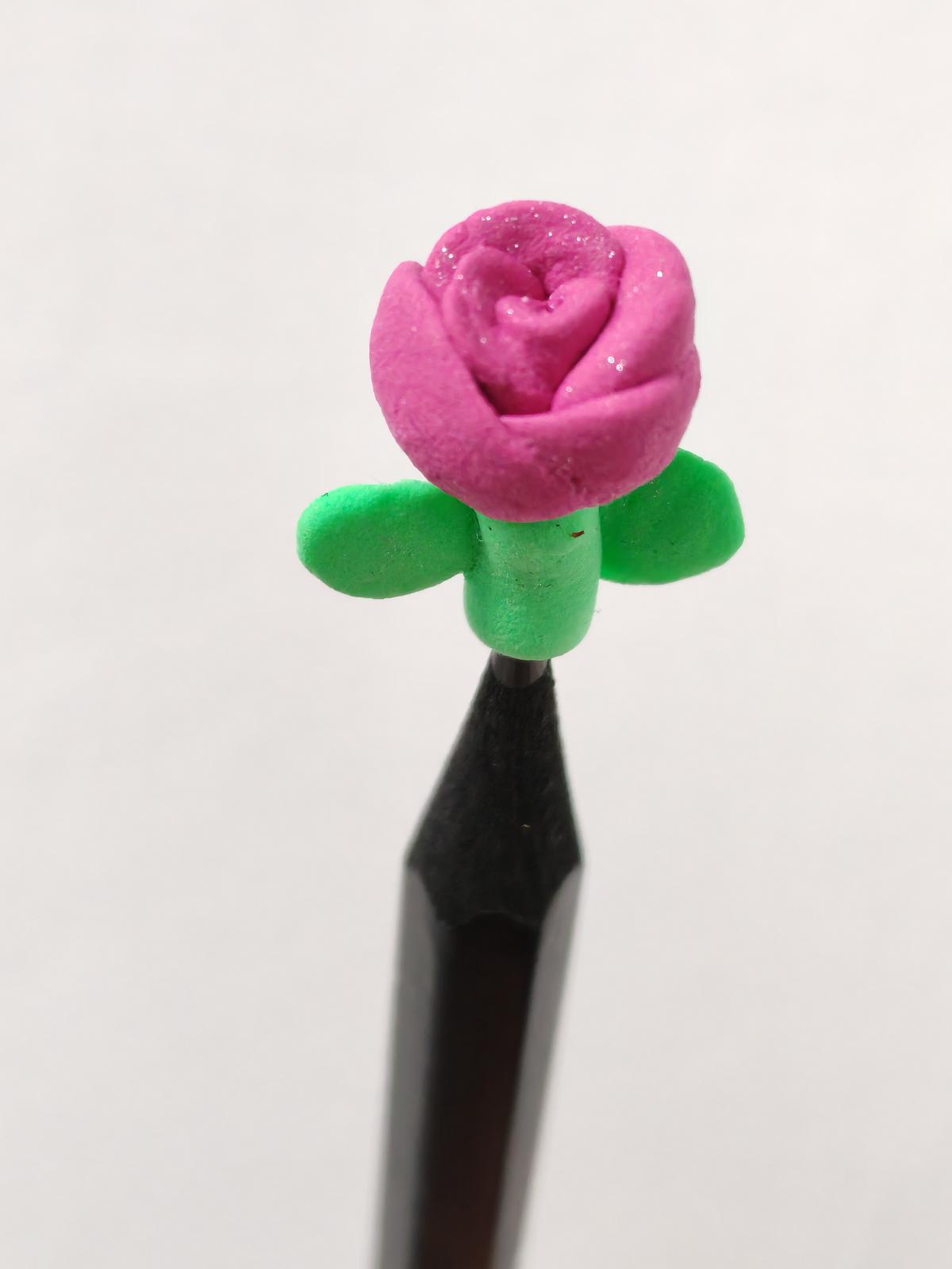 笔杆是微凉的,顶端却“开”了朵卷得滚圆的粉玫瑰,花瓣是一层一层包裹着捏出来的,最内一圈的褶皱里用带闪粉的马克笔“刷”了些银闪粉,灯光下,像落入凡间的碎星,玫瑰的绿茎上左右对称,粘了两瓣小叶子,仔细一看,叶片上她用心按出有规则的印子作为叶脉。