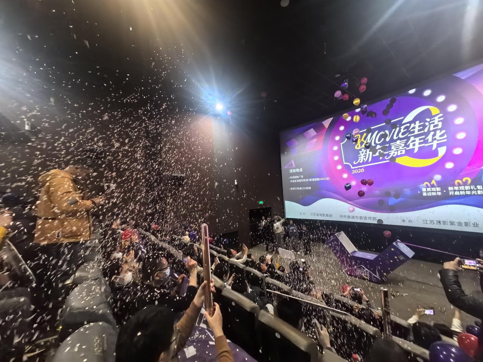 影厅外,互动游戏氛围感满满;影厅内,气球与彩带仪式感十足。“5、4、3、2、1——新年快乐!”2026年零点钟声在全场齐声倒数中敲响。气球腾空,彩屑纷飞,欢呼声席卷全场。在《明天会更好》的歌声中,观众一起为这个跨年夜画上温暖句号,共同奔赴2026年的崭新征程。