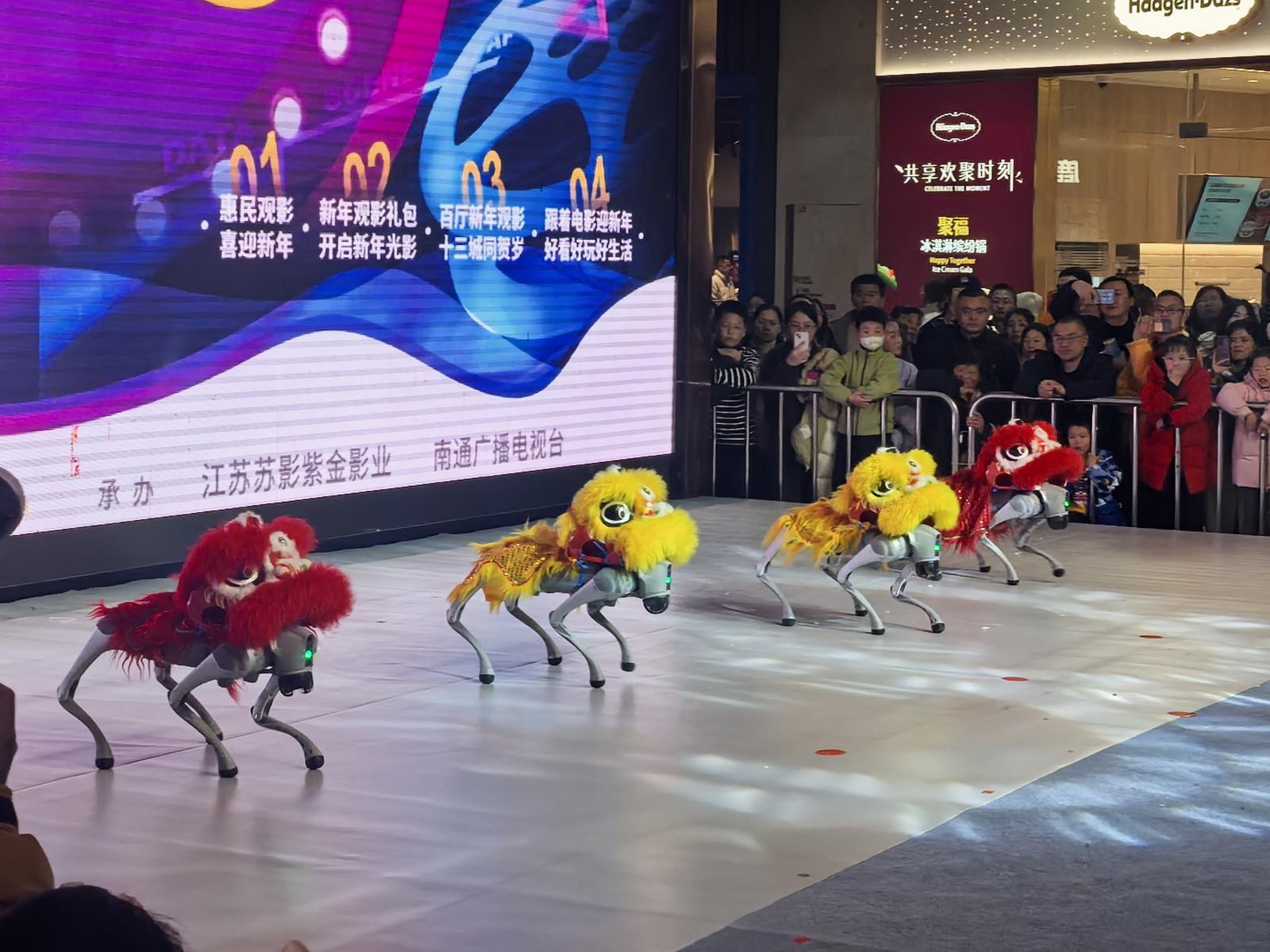 在圆融广场主会场,伴随着《神偷奶爸2》主题曲《Happy》的动感旋律,一只只科技感十足的机器狗踏着节奏走上舞台中央,携手主持人向观众致意,拉开当晚主体活动的序幕。红金相间的舞狮服搭配灵活的扭臀、摆头动作,融合现代科技与传统文化的机械狗舞狮表演引起阵阵掌声。