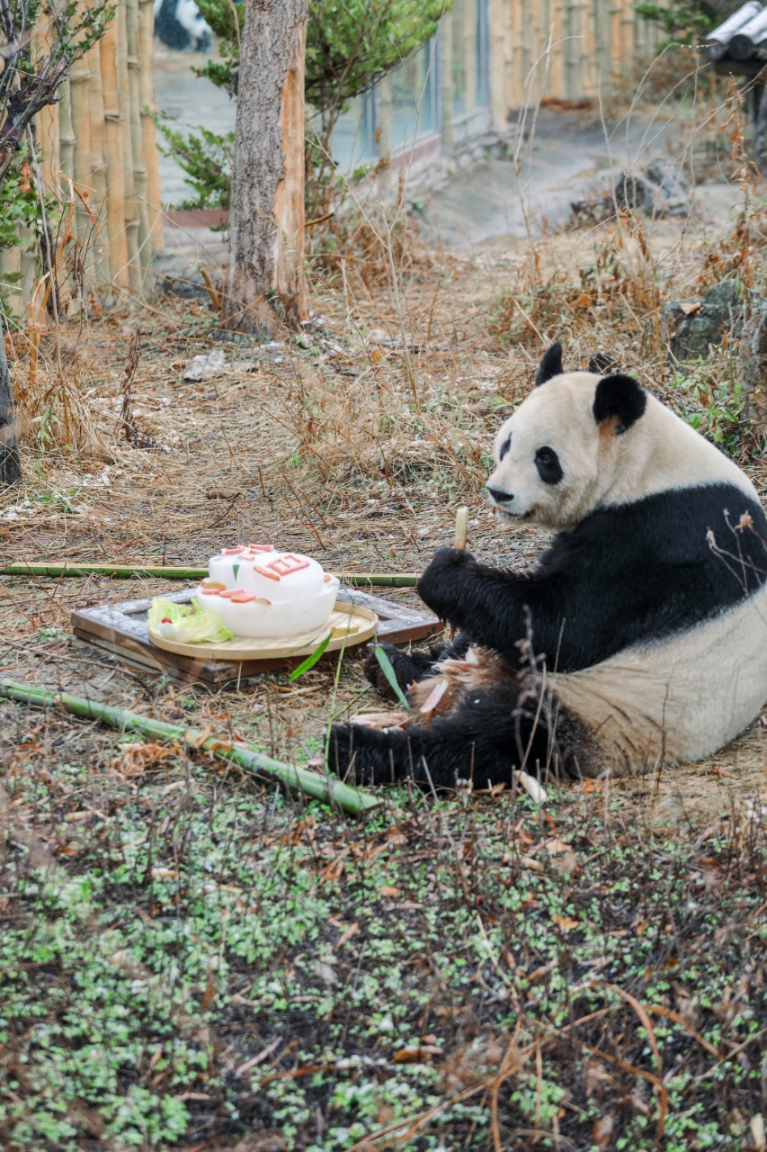 薄雪覆盖的草地上,“星繁”悠闲坐卧在木台边,爪子紧紧抱着竹笋,啃得香甜满足;“星辉”则蜷在冰蛋糕旁,专注扒拉着苹果片,吃得不亦乐乎。黑白相间的身影沾着细碎雪花,憨态可掬的模样萌化人心。饲养员介绍,冰蛋糕不仅能为食物保鲜,其爽脆口感更是大熊猫的心头好。活动区外,不少游客驻足观赏,纷纷拿出手机记录这温馨画面,直呼在雪天里看萌兽过节,既有趣又暖意满满。