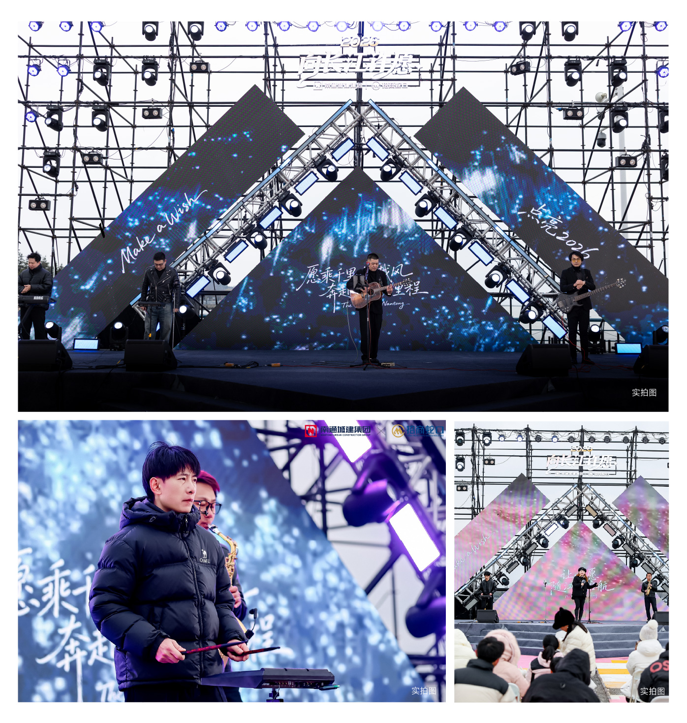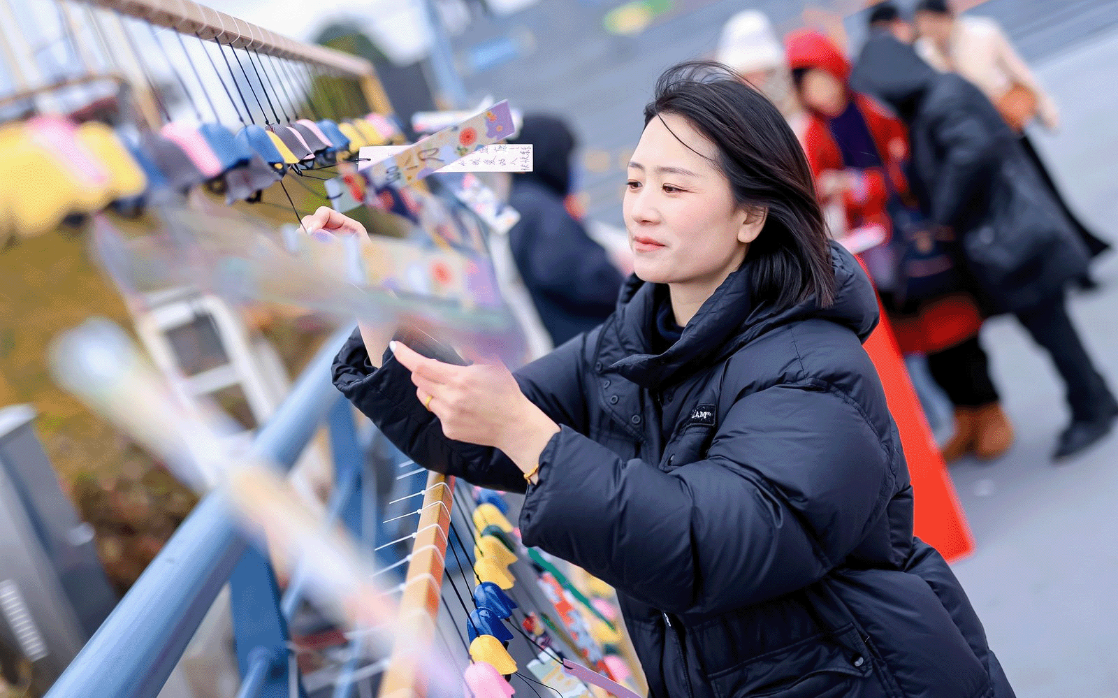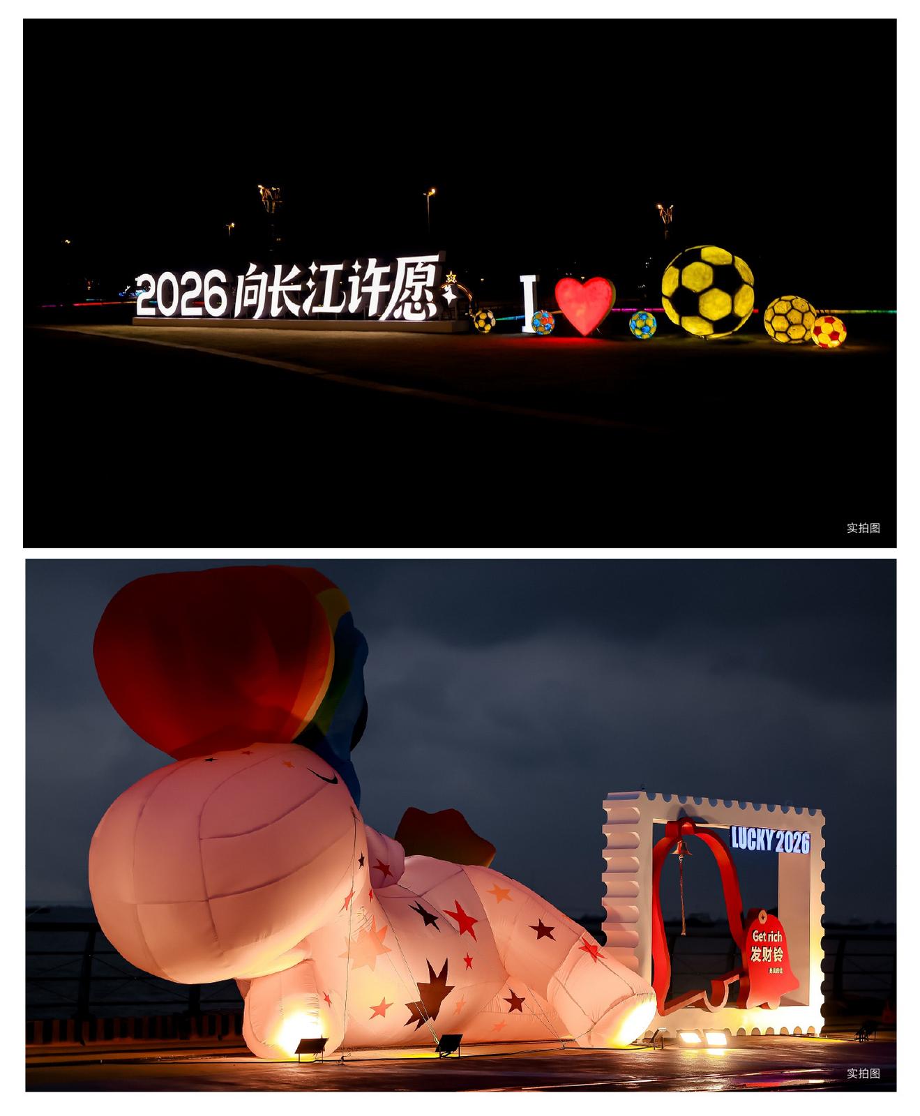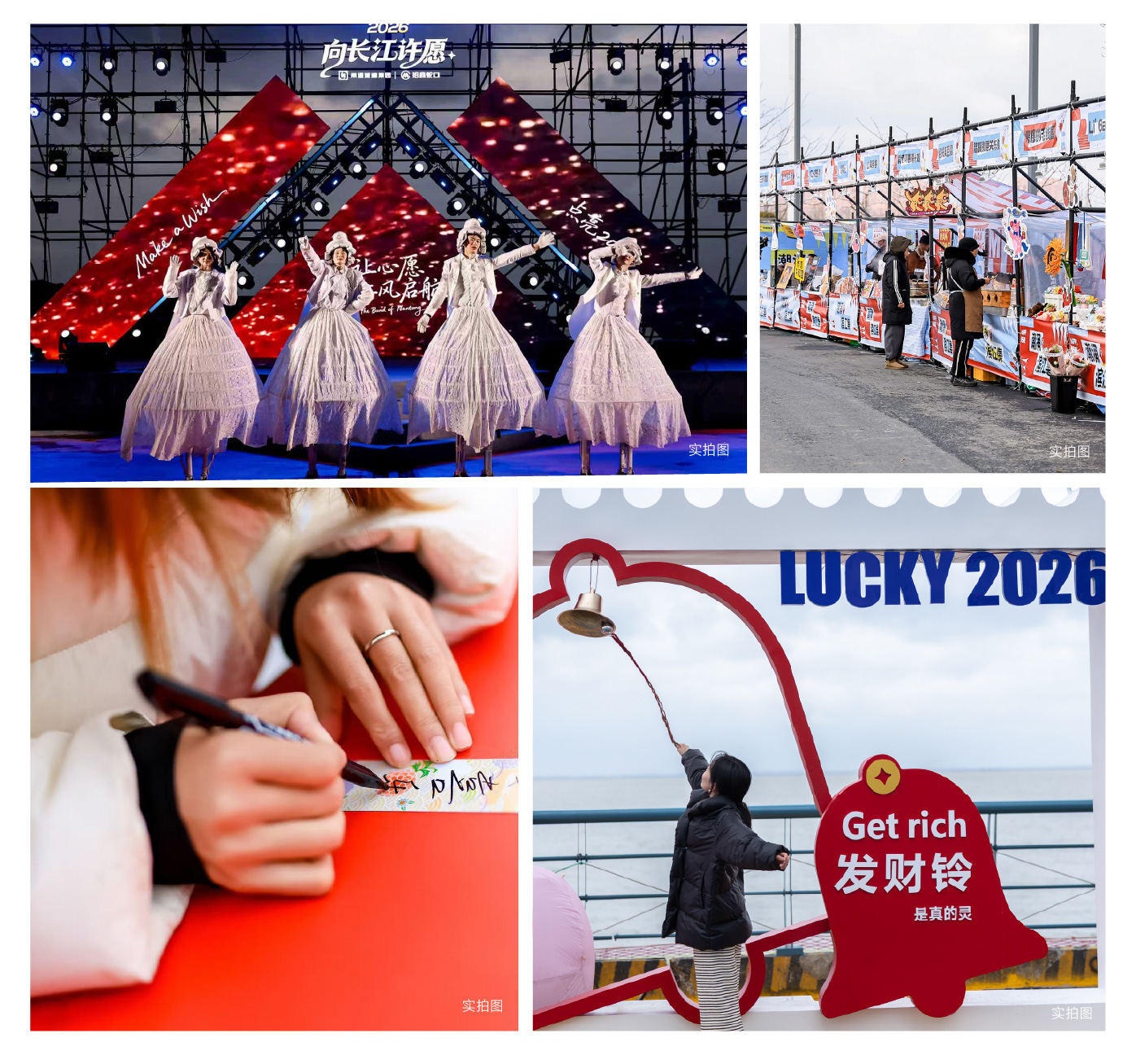 奔跑的激情落幕,江边的许愿盛宴正式登场。长江体育公园化身“心愿聚集地”,多元活动让“在江边过年”的氛围愈发浓厚。长江落日音乐节以江岸为幕,悠扬旋律中,市民们或并肩而立,或轻声合唱,在声光交融中默默诉说新年心愿;乌镇戏剧节特邀剧目与灵动花车组成的艺术巡游,将戏剧的浪漫与许愿的仪式感相融,让江风传递着人们对美好生活的向往;新年心愿市集里,30余家特色品牌齐聚,TinioBear、福瑞女孩等文创IP与地道风物相映成趣,市民们在挑选好物的同时,纷纷写下心愿卡片,2026个新年愿望在风中飞扬,让千年江水流淌着满满的烟火气与期许感。