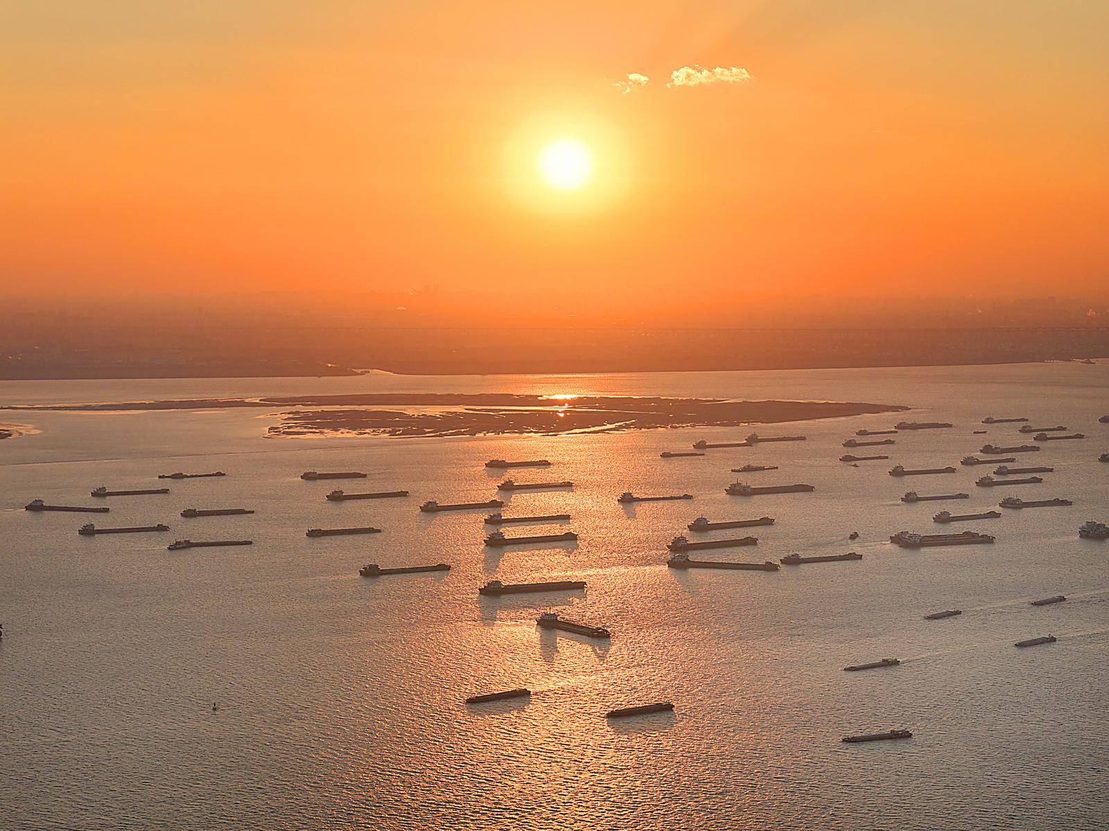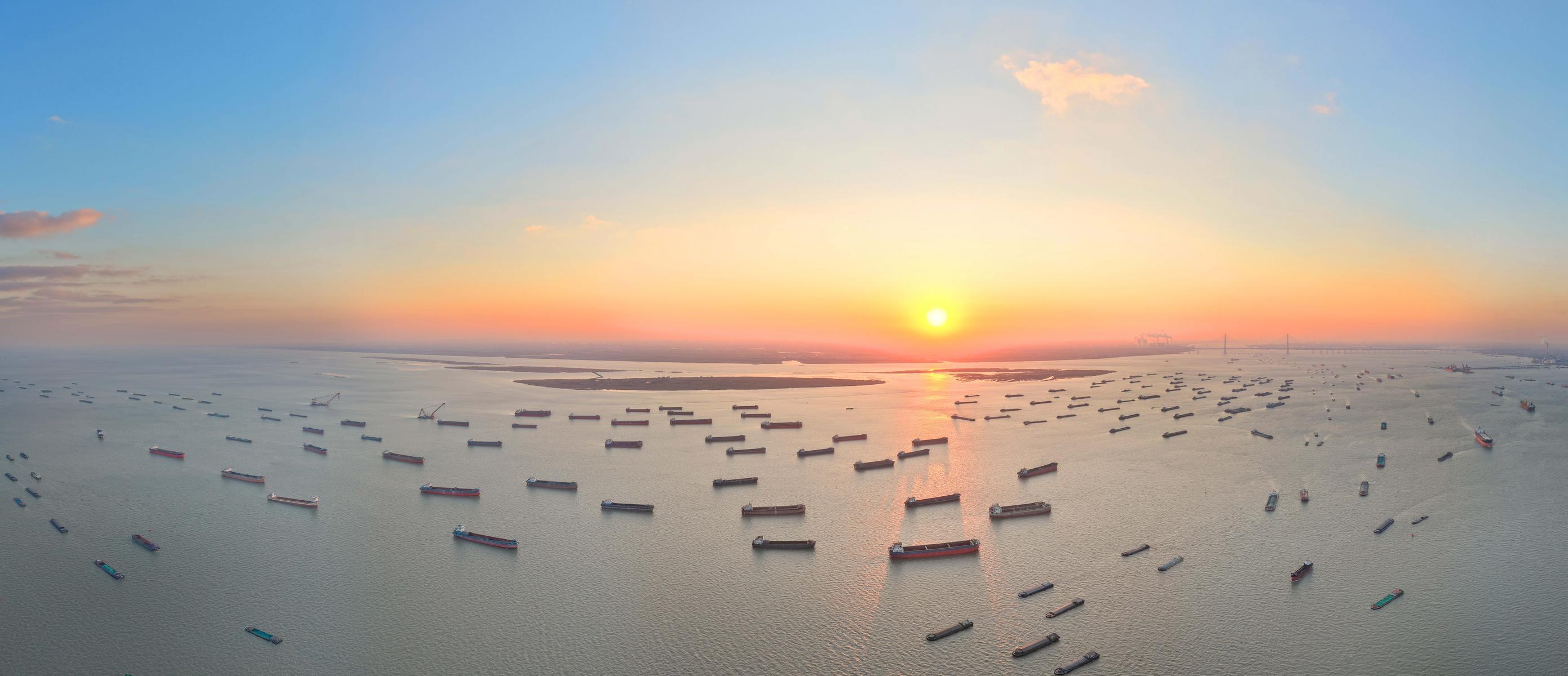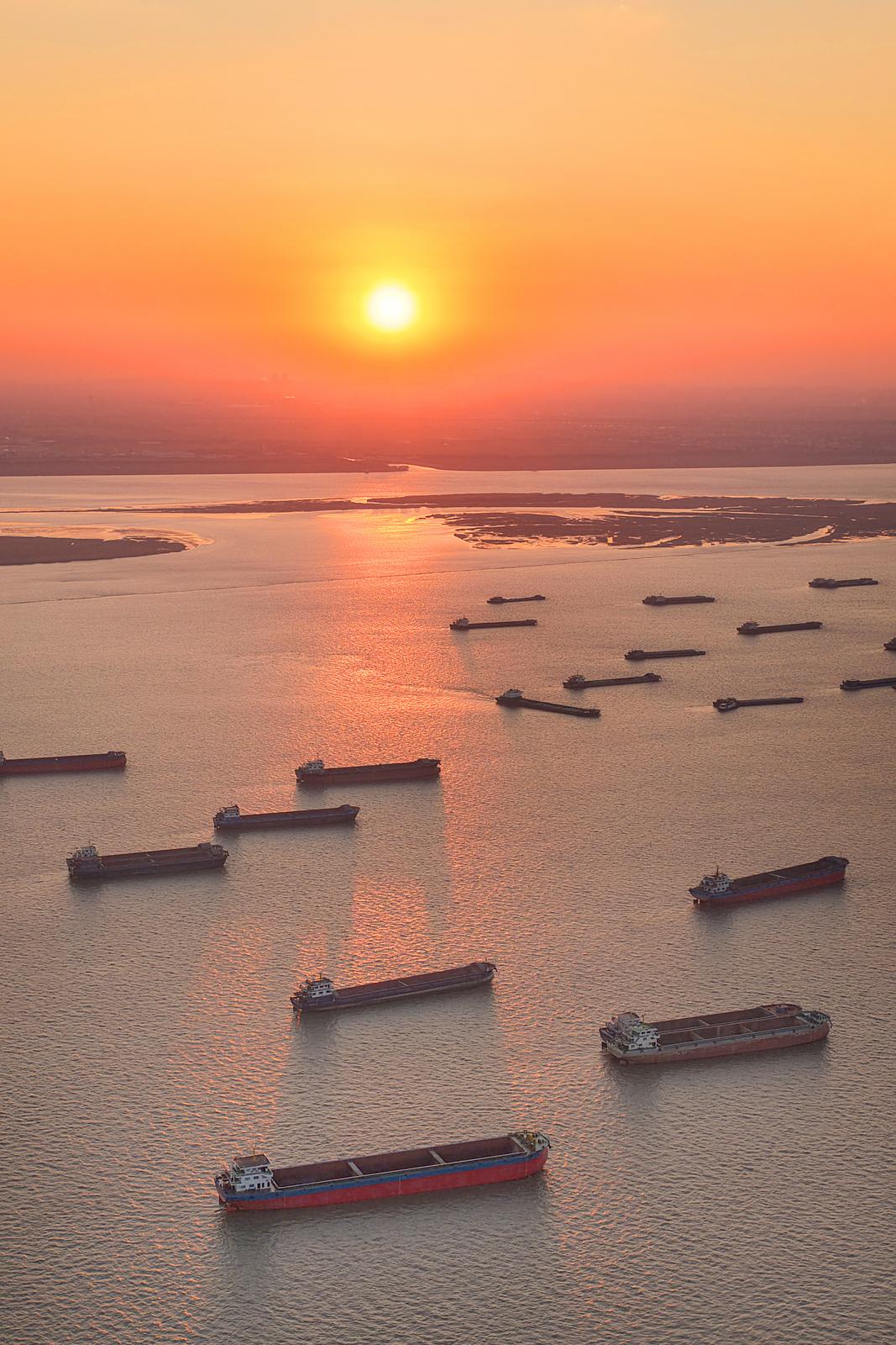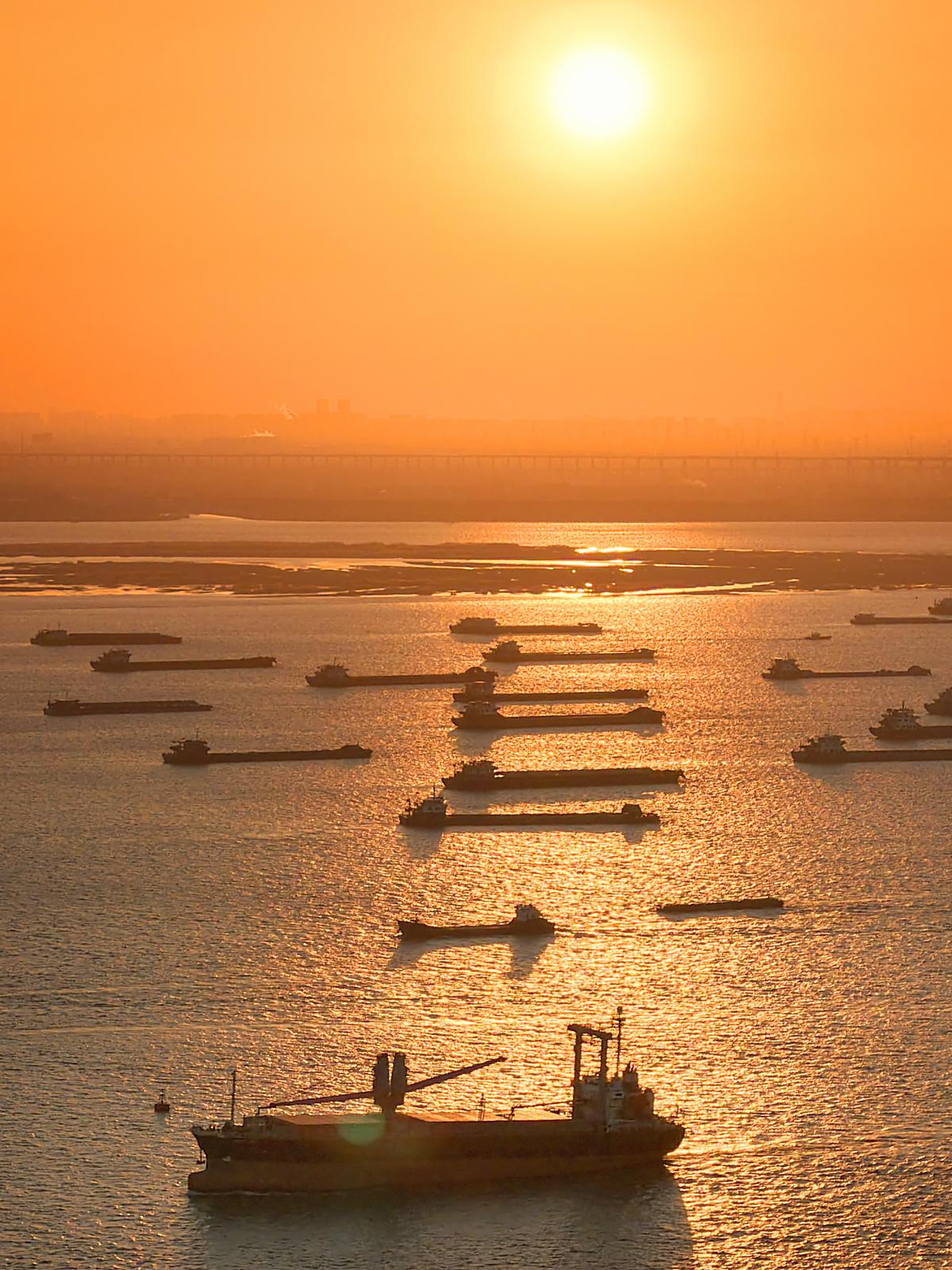 2026年1月2日在长江南通崇川段江面上拍摄的众多船舶。当日是元旦假期第二天,长江上往来货船有序航行,一片繁忙的景象。