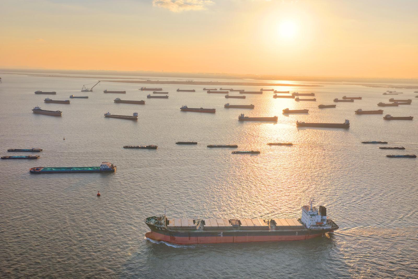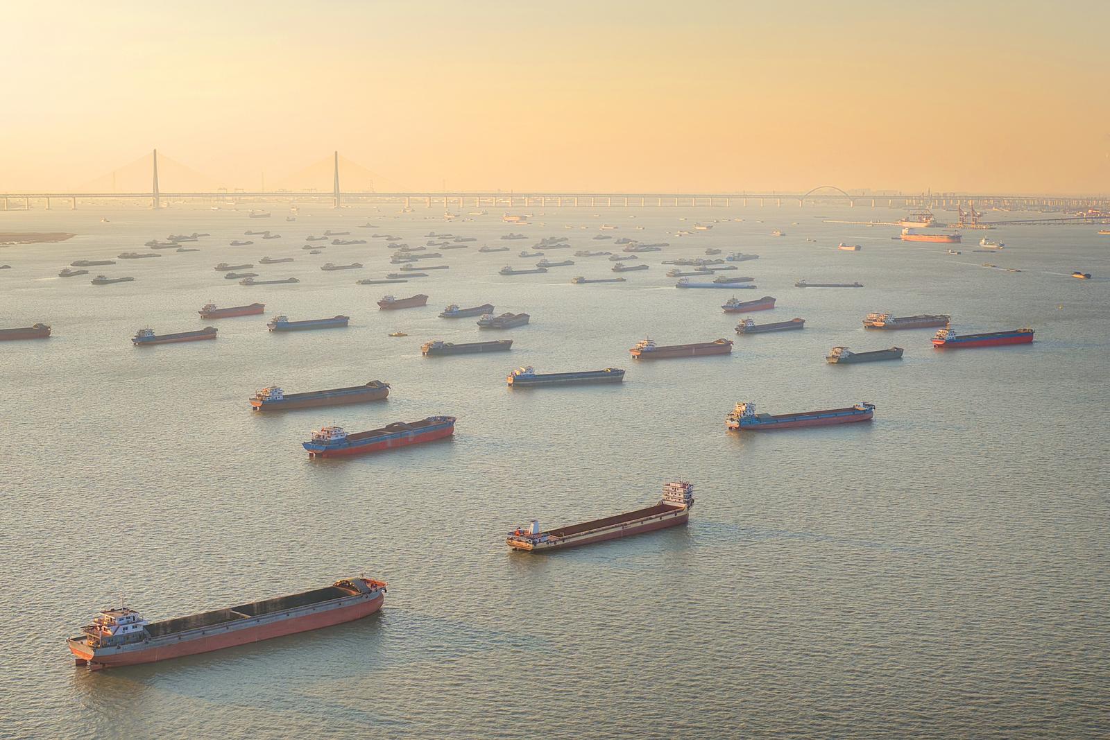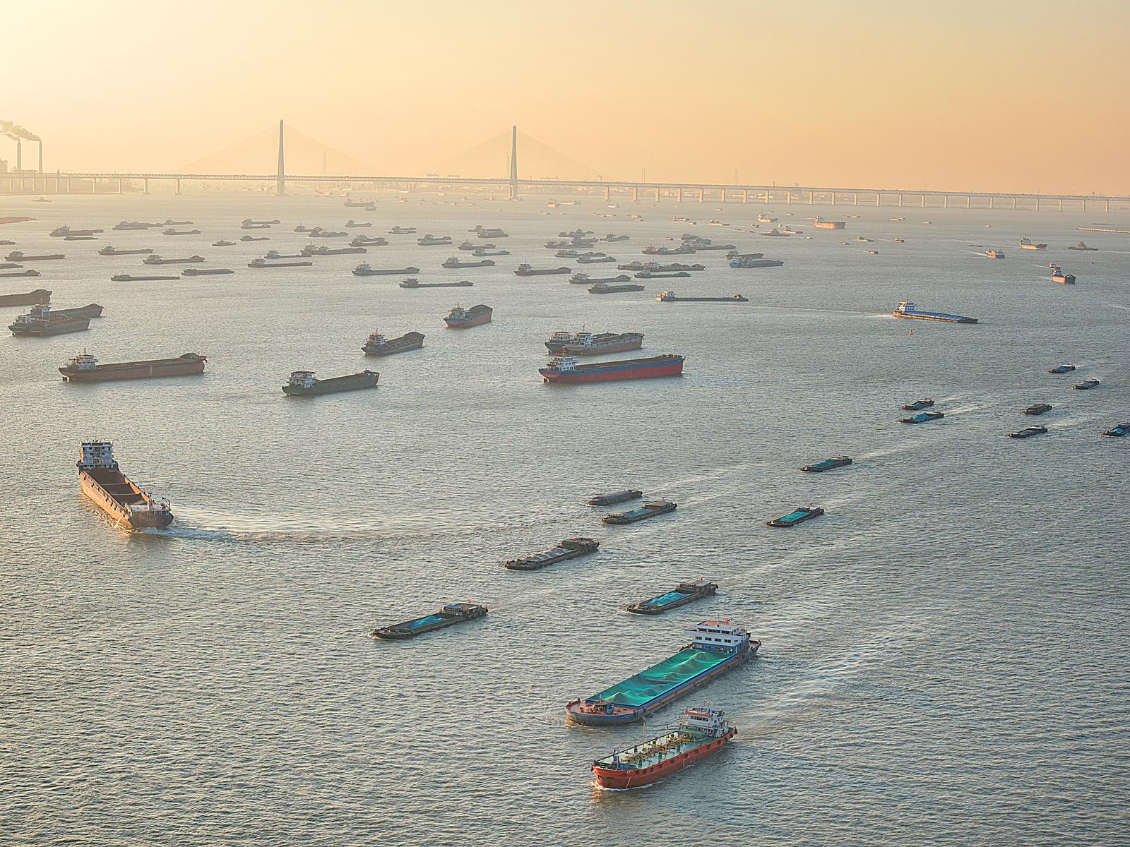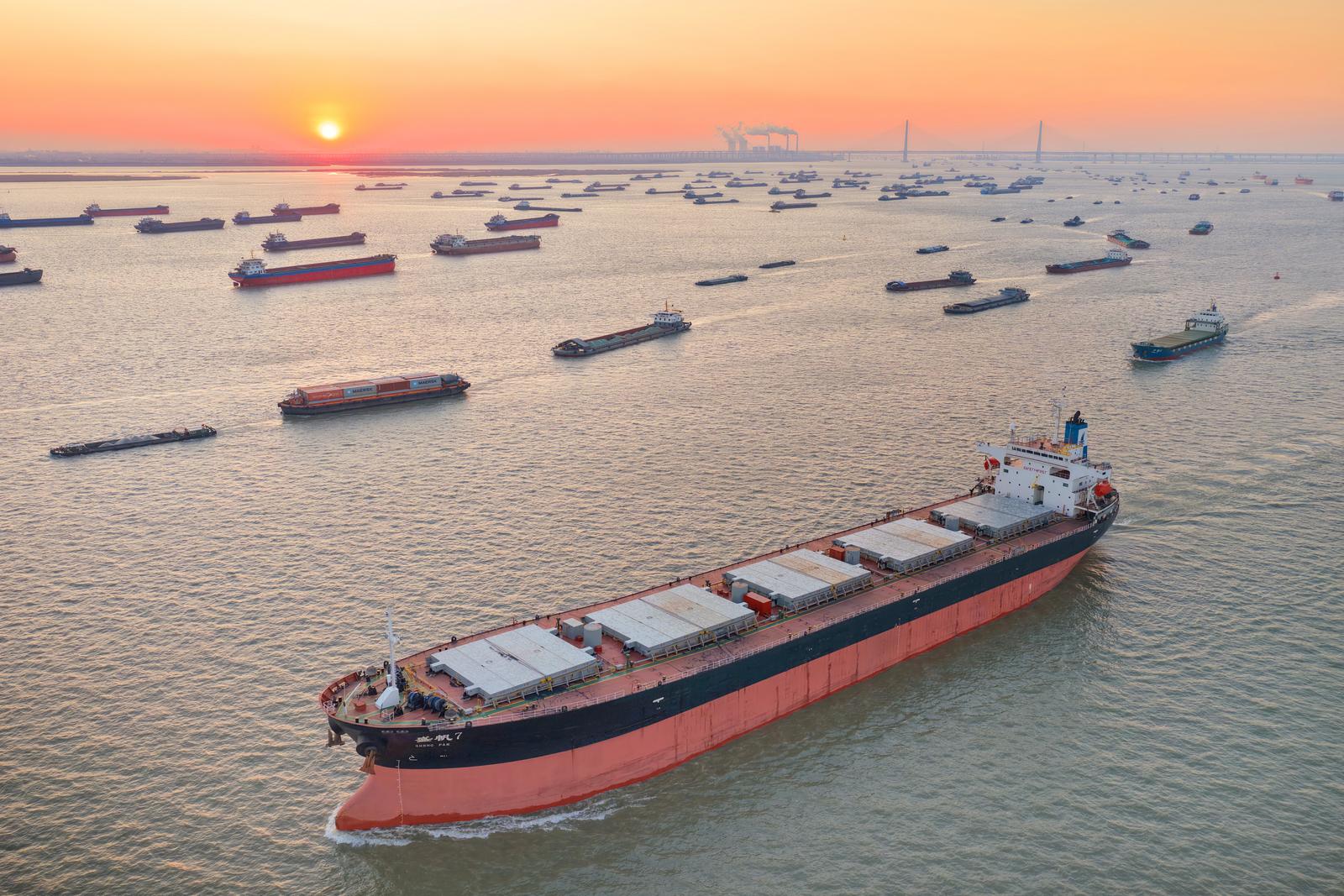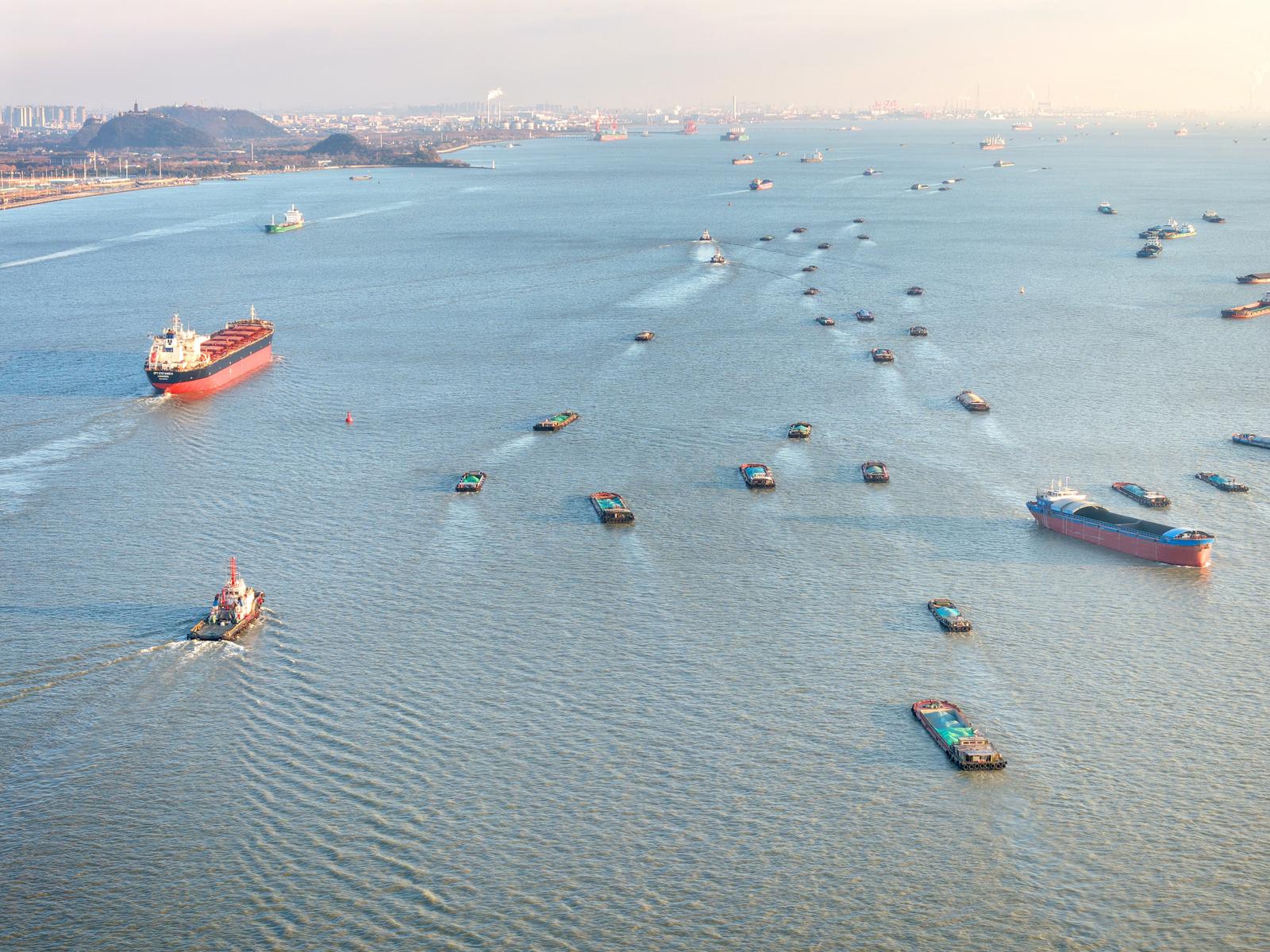 2026年1月2日在长江南通崇川段江面上拍摄的众多船舶。当日是元旦假期第二天,长江上往来货船有序航行,一片繁忙的景象。
