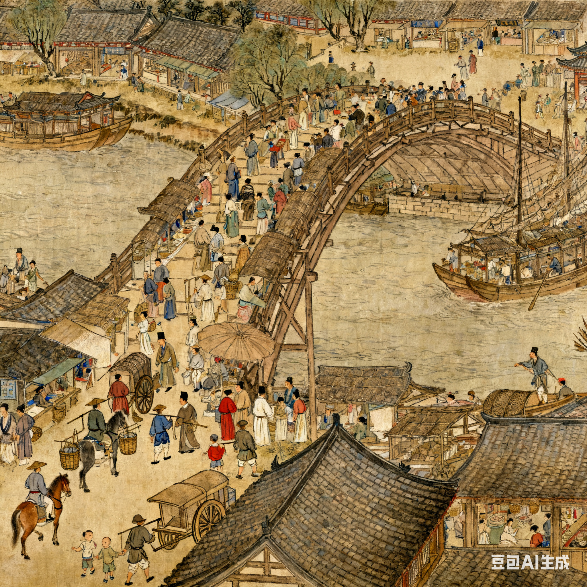 最热闹处就是汴京城的著名景点虹桥。这是一座规模宏大的木质拱桥,体现了北宋高超的桥梁建造水平。虹桥附近水面航行着载人客船、观光画舫、运货漕船等。桥下正在经历惊险的场面:一艘大船正在紧急放倒桅杆,差点撞桥了……虹桥既是交通要道,桥上也成了贸易集市,人来人往,生意火爆。拥挤的桥上,一个轿夫和一个马夫吵了起来,都要先过,互不相让。