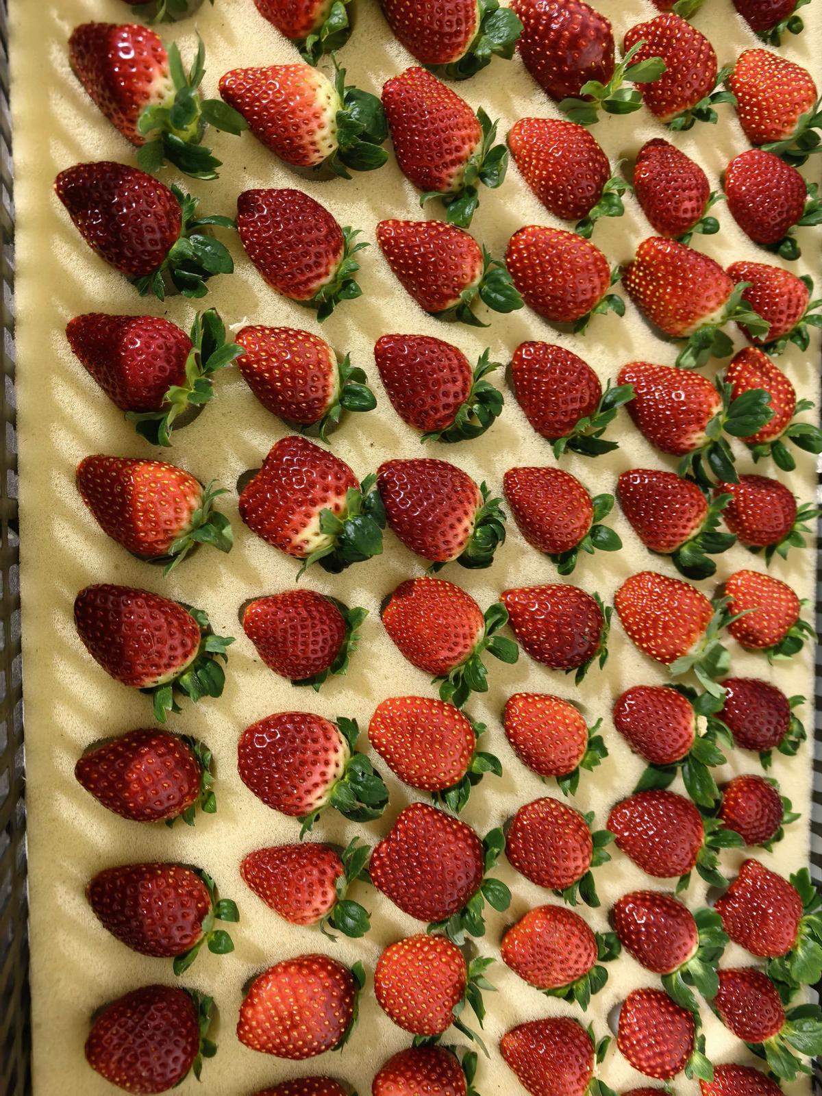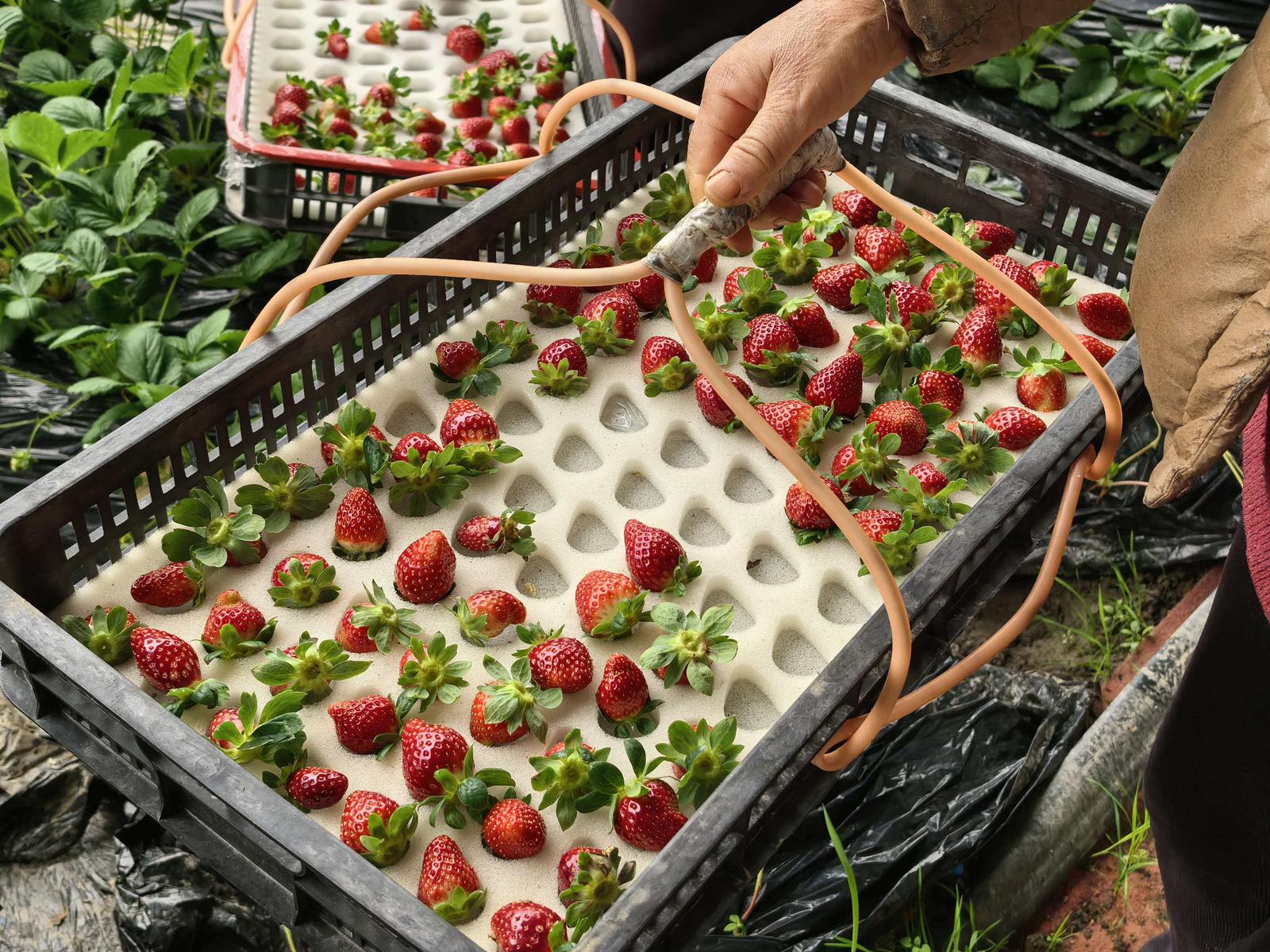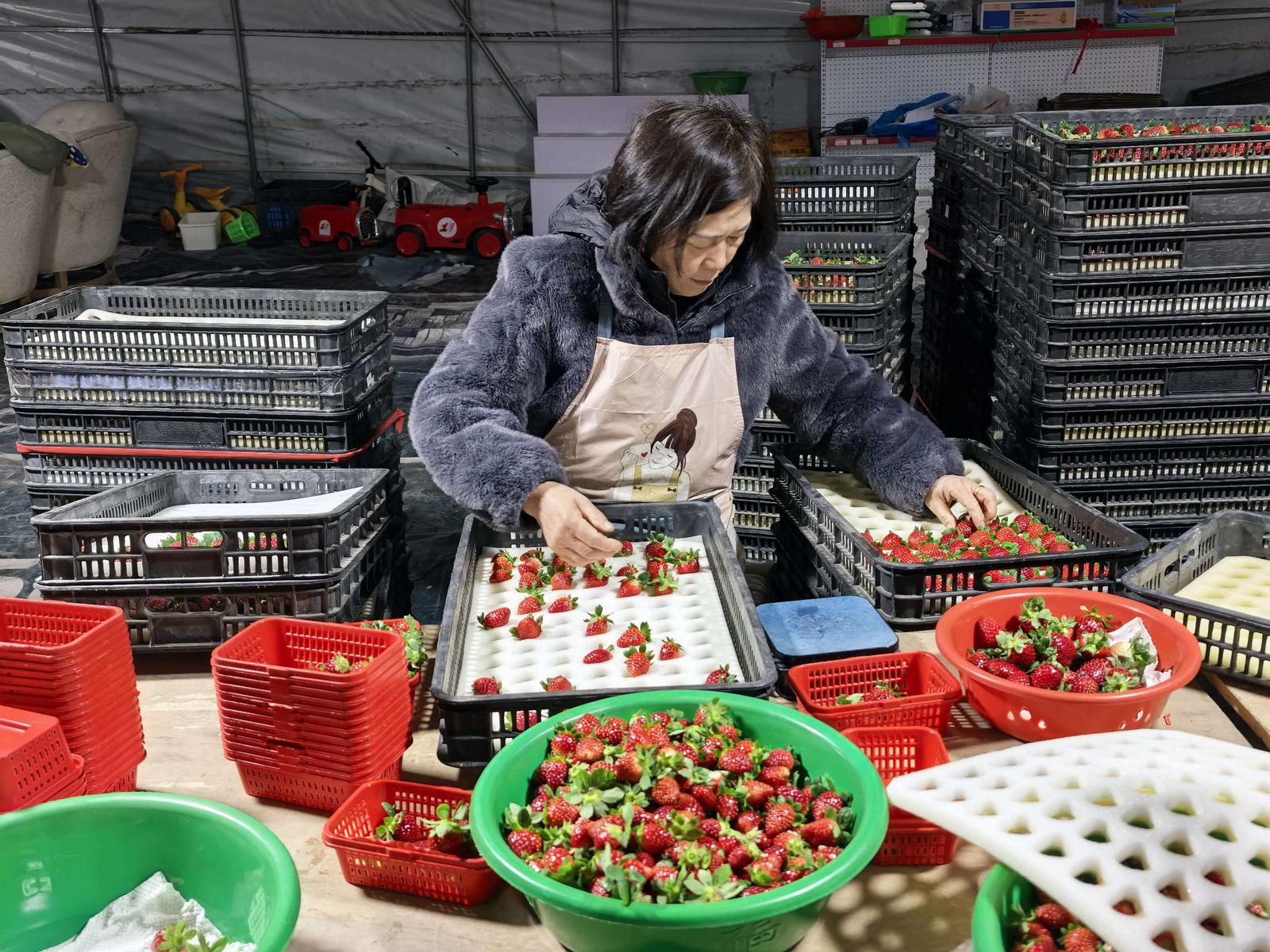 当前,基地70%的第一茬“黑珍珠”已到采摘尾声,但每天仍能收获200多公斤的新鲜果实。在基地货仓内,工人正忙着对刚采摘的草莓进行初筛,剔除残果、坏果后,按照1斤净果的规格装入包装盒,整齐码放在筐中。货仓外,来自上海的运货车早已等候就绪,这些草莓将在第二天一早新鲜亮相长三角地区的“盒马鲜生”等商超门店。