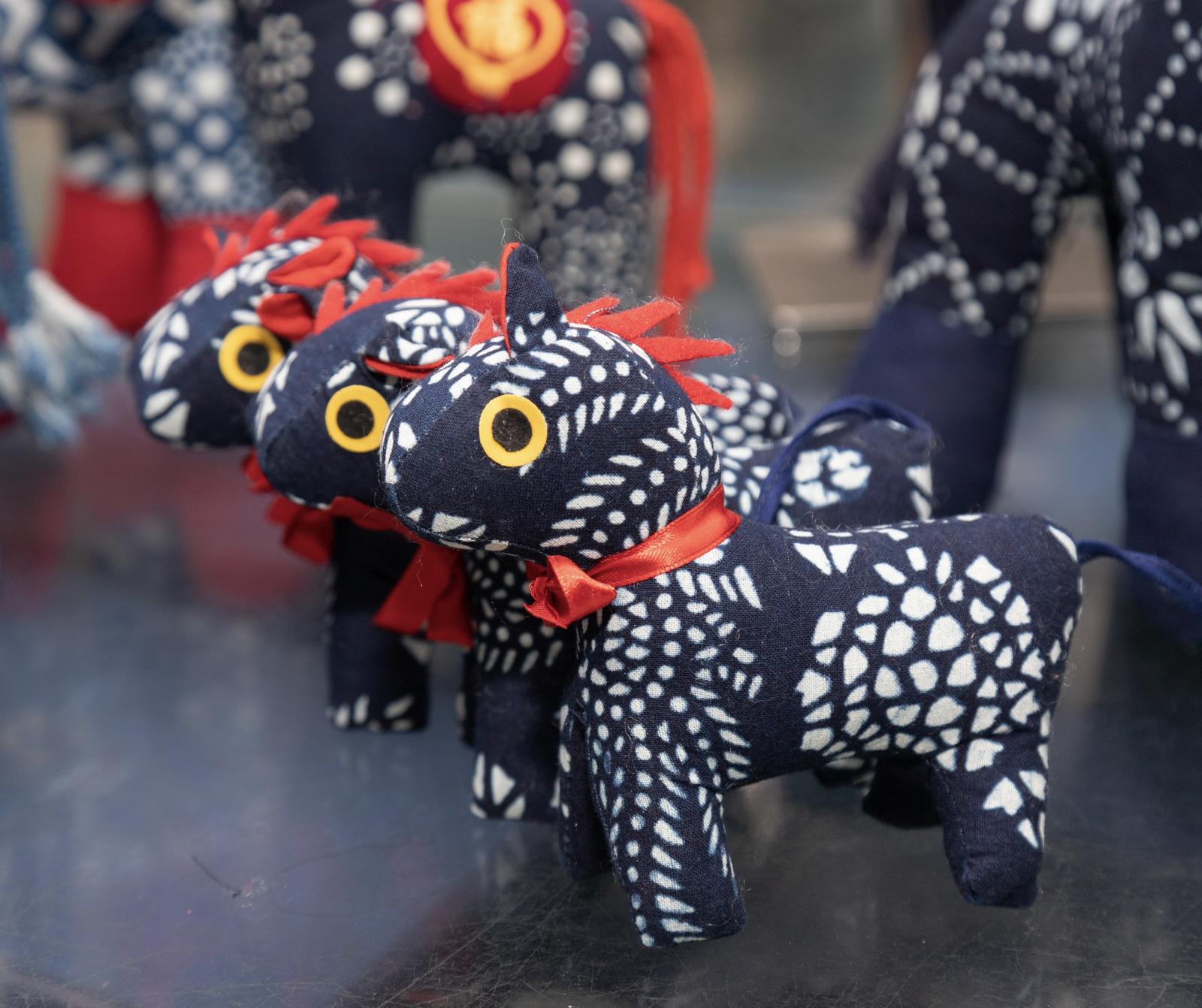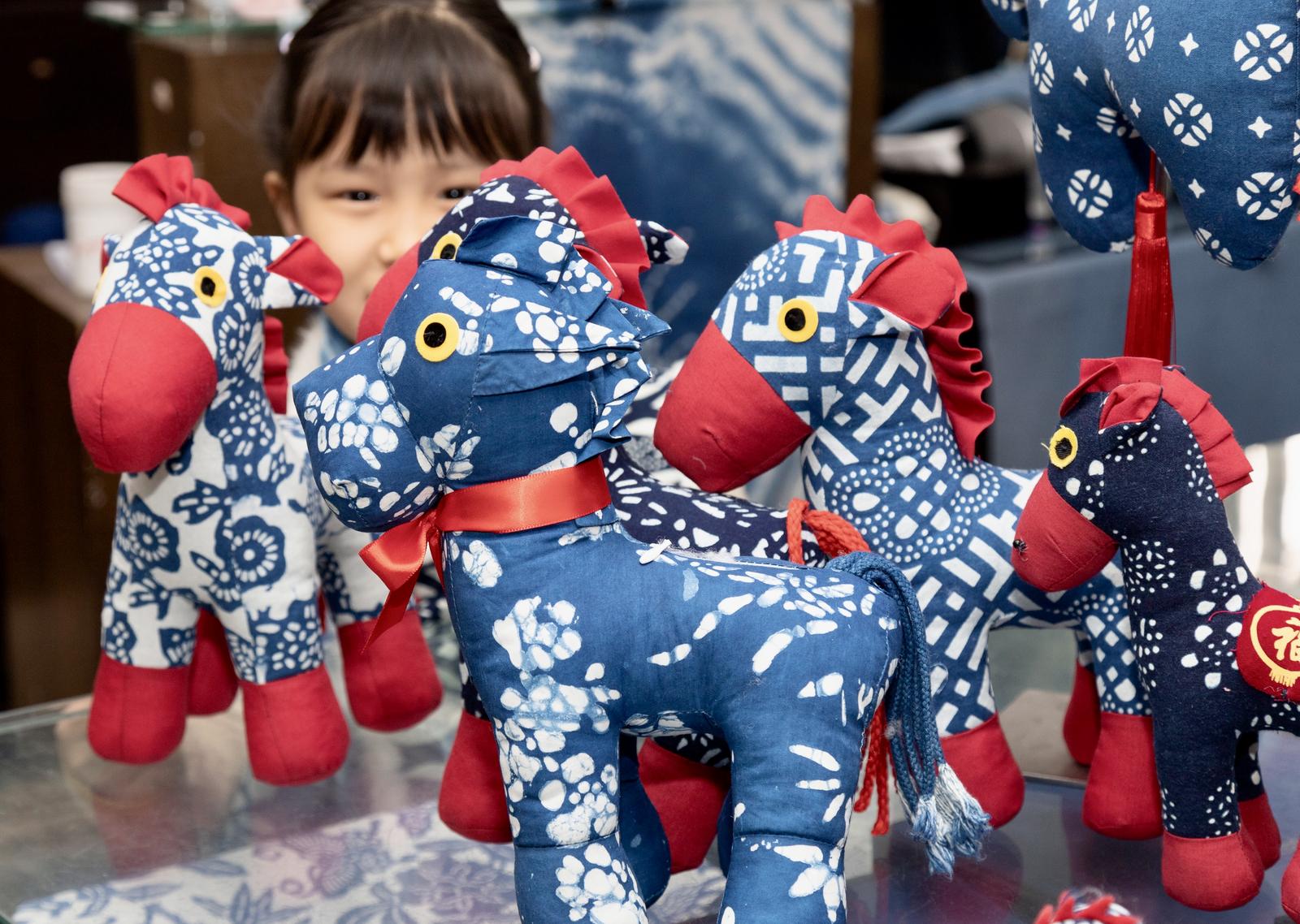 据南通蓝印花布博物馆副馆长倪沈键介绍,12年前的马年,“元新蓝”团队首次尝试设计制作生肖玩偶,获得好评满满。经过12年的反复精雕细琢,今年的新系列生肖玩偶在纹样设计上更为丰富。除了传统花草、几何图案外,部分玩偶融入抽象线条或符号化装饰,比如马身缀以细腻的纹理拼接、鬃毛与尾部的流线型处理,使得造型更显灵动。