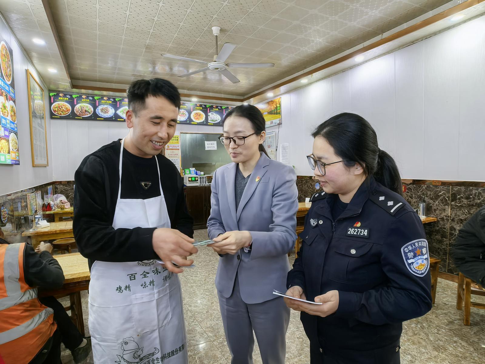 讲座结束后,社区工作人员与“警银保”专班成员直奔居民小区及街坊商圈,紫琅湖派出所柳警官耐心询问可疑电话、短信接收情况,手把手指导老年居民开启反诈预警,并送上宣传手册。来自甘肃的流动党员马玉鹏在金地峰汇经营着兰州拉面馆,他说:“谢谢组织的关心,手把手教我怎么防骗,这样的服务太暖心了。”