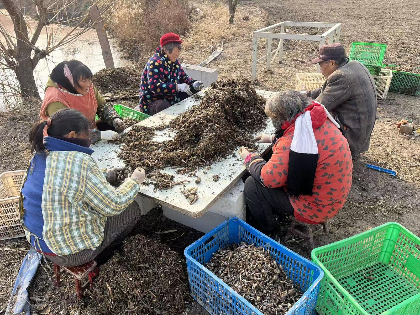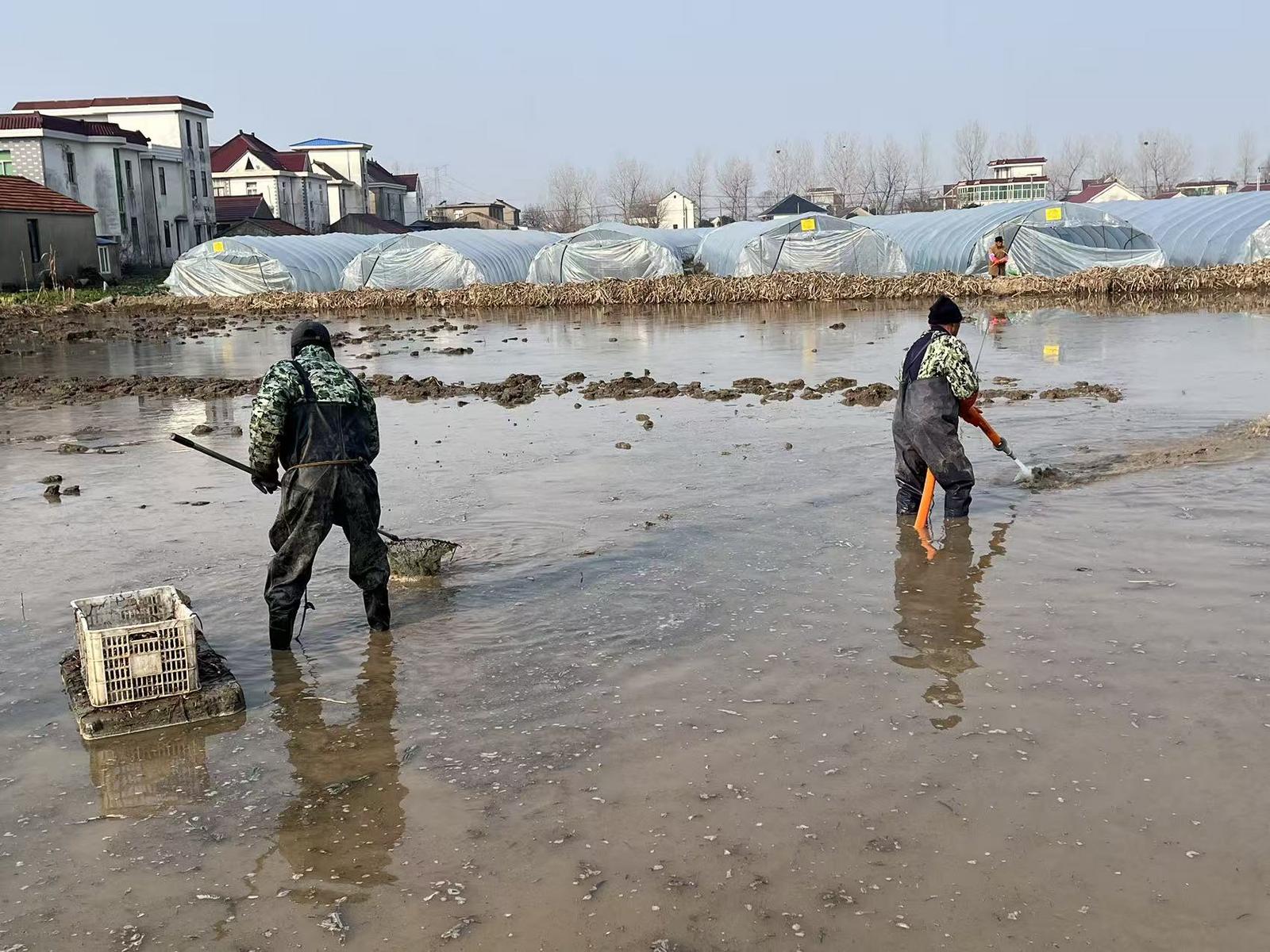 8日,在通州区东社镇唐洪村的紫皮茨菇种植基地,工人们身着防水裤,手持水枪冲刷淤泥,再将漂浮在水面的茨菇快速捞入筐中。不远处的分拣点内,刚出土的茨菇带着湿润的泥土,散发出清新的自然气息,轻轻拨开茨菇表面的枯皮,其独特的紫色外衣便展露无遗。工人们正细致地剔除杂草,再按照个头大小进行分级分拣。