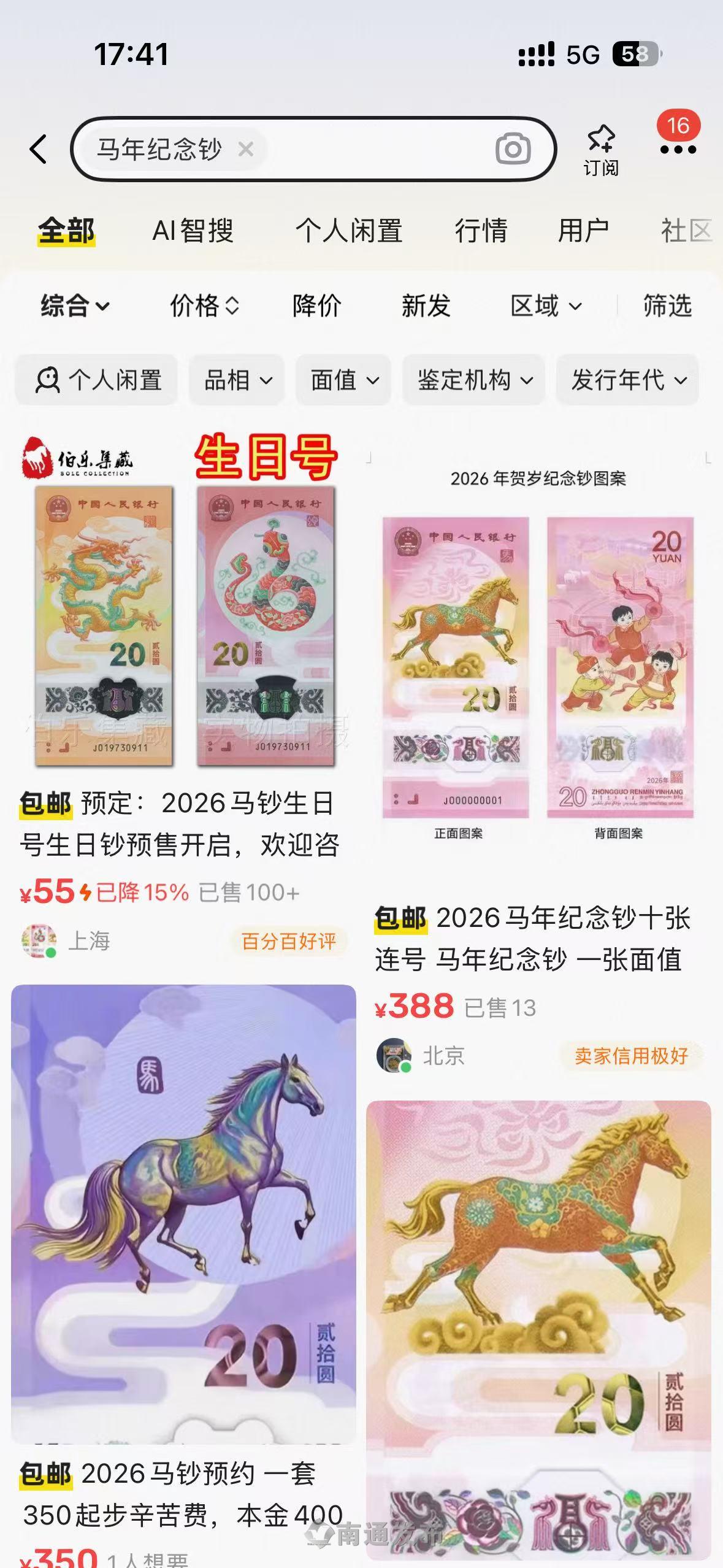 “当时,我以纪念钞690元(20张)、纪念币270元(一卷)的价格,从个人卖家手里买到。”她回忆说,“后来,龙钞还小幅涨到了45元一张。”张女士观察到,受龙钞行情带动,去年蛇钞也持续走热。她坦言,虽然在闲鱼平台上二手价格溢价严重,但收藏热度确实一年比一年高,尤其生肖题材更是一钞难求。此次马年纪念钞发行,志在必得的她已提前在银行APP上绑定好个人信息,并设置了闹钟提醒,下决心一定要抢到。