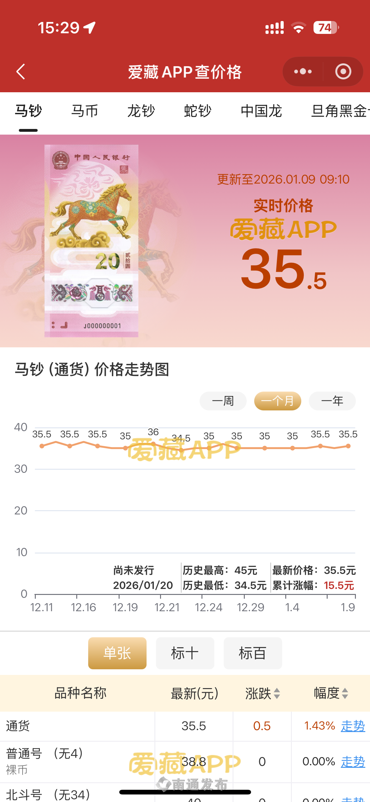 市场行情方面,截至1月9日9时10分,“爱藏”APP显示龙钞报价每张35.5元,龙币每枚14.3元。尽管马钞尚未正式发行,二手平台已出现高价预售链接,如“十张连号售价388元”“生日号预定单张55元起”等,且卖家多标注“涨跌无悔,不可退款,拍前仔细阅读,拍后不退不换”。