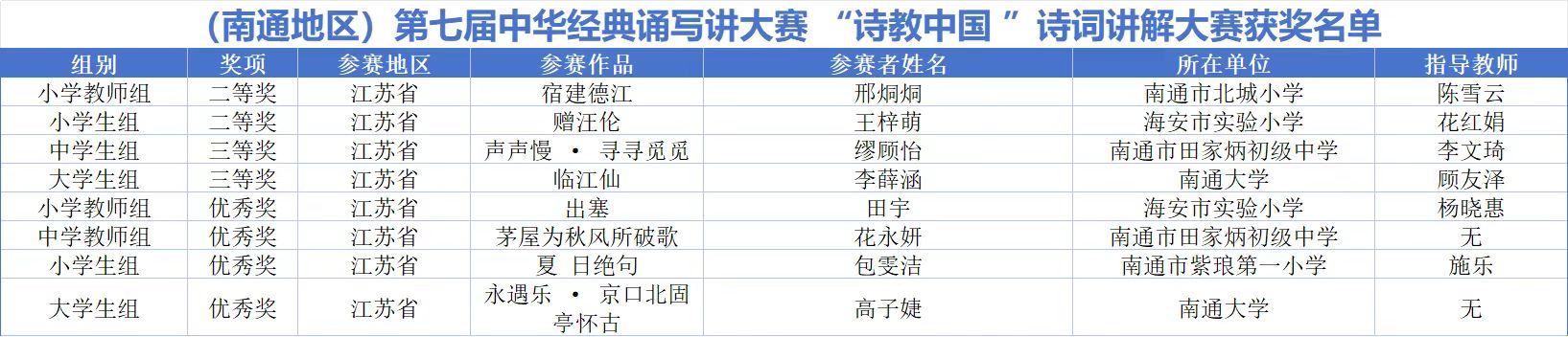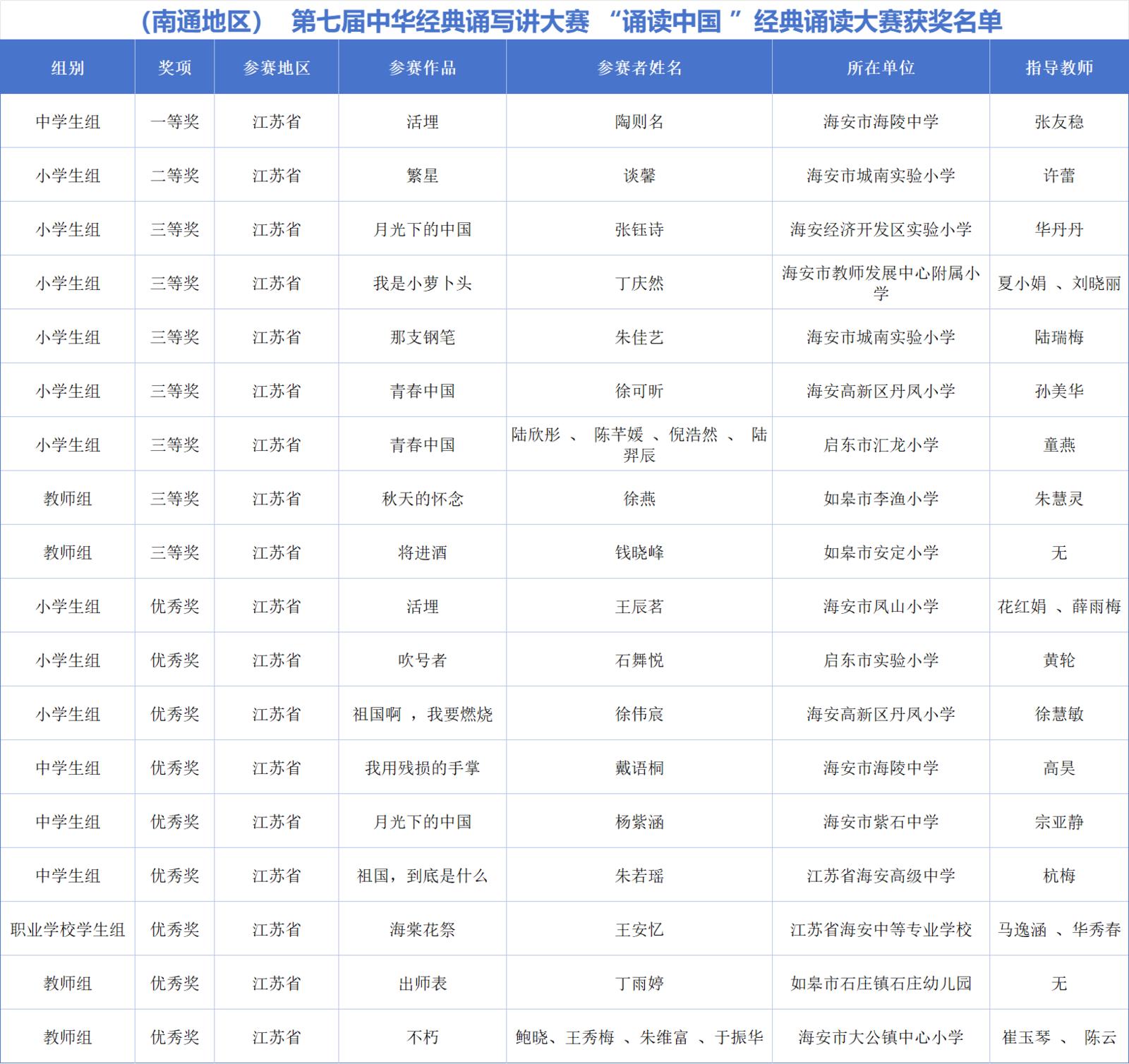近日,由教育部、国家语委主办的第七届中华经典诵写讲大赛获奖名单公布。来自南通大学、南通师范高等专科学校、南通市紫琅第一小学、南通市北城小学、海安市海陵中学、启东市汇龙小学、如皋市安定小学等校的师生凭借深厚的文化素养与扎实的专业功底斩获一等奖2件、二等奖5件、三等奖17件及优秀奖18件。
