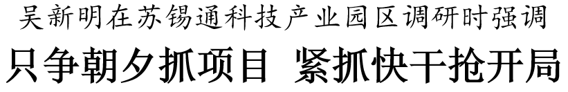 今天(1月12日),市委书记吴新明前往苏锡通科技产业园区调研。他强调,要深入学习贯彻党的二十届四中全会精神和中央经济工作会议精神,认真落实省委要求,按照市委经济工作会议和全市重大项目建设动员大会部署,聚焦高质量发展首要任务,坚持“项目为王”不动摇,只争朝夕、紧抓快干,抓项目、强产业,推动一季度开好局起好步,为全市高质量发展作出更大贡献。