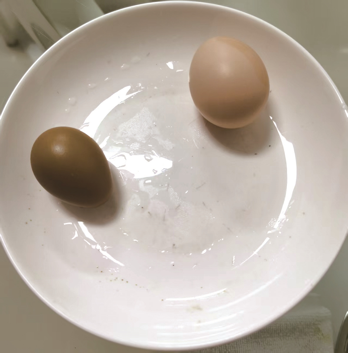 每天的早餐盘里都有两个土鸡蛋,但今天的早餐盘里不同往日,一个是土鸡蛋,另一个是比土鸡蛋小的野鸡蛋。