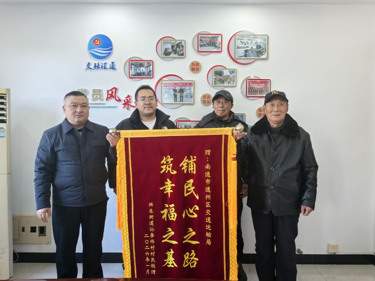 “铺民心之路,筑幸福之基。”1月12日,通州区兴东街道孙李桥村的村民专程送来锦旗,为新改建的“民心路”表达诚挚谢意。