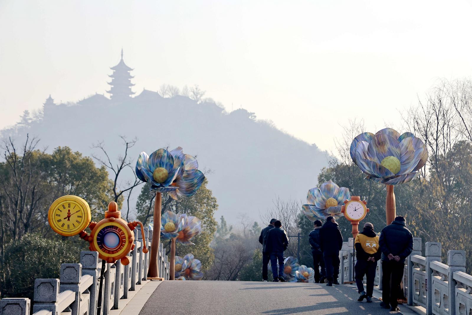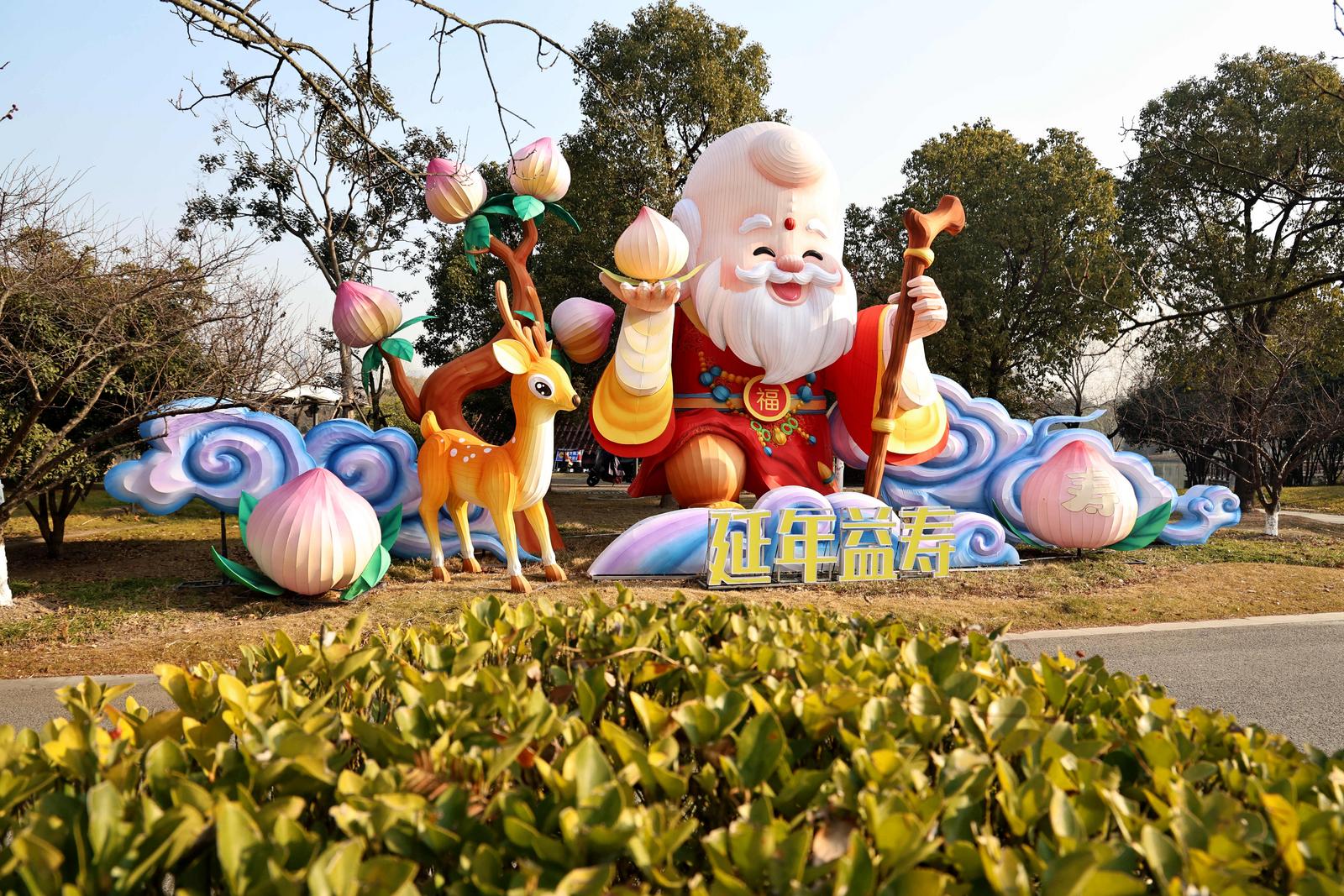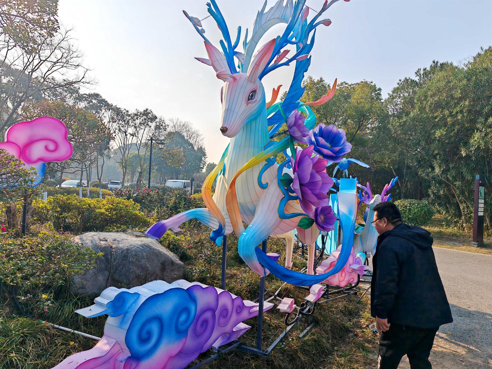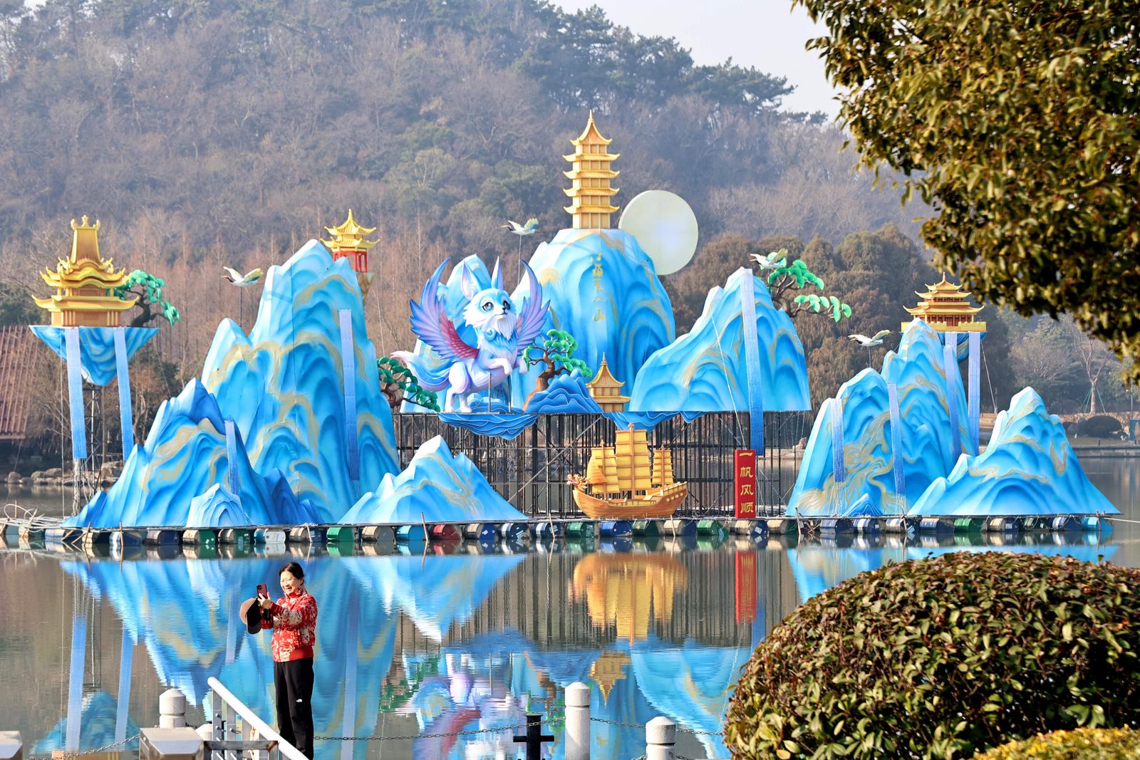 本次灯会由四川自贡彩灯匠人精心雕琢,设有三大主题展区,主打《以梦为马》《花仙胜境》《招财纳福》等特色灯组造景。赏灯路线从狼山北门起始,环绕映山湖一周,全长约1.36公里。1月15日,记者在现场看到,不少彩灯已初具雏形,光影交织间显露出节日氛围。