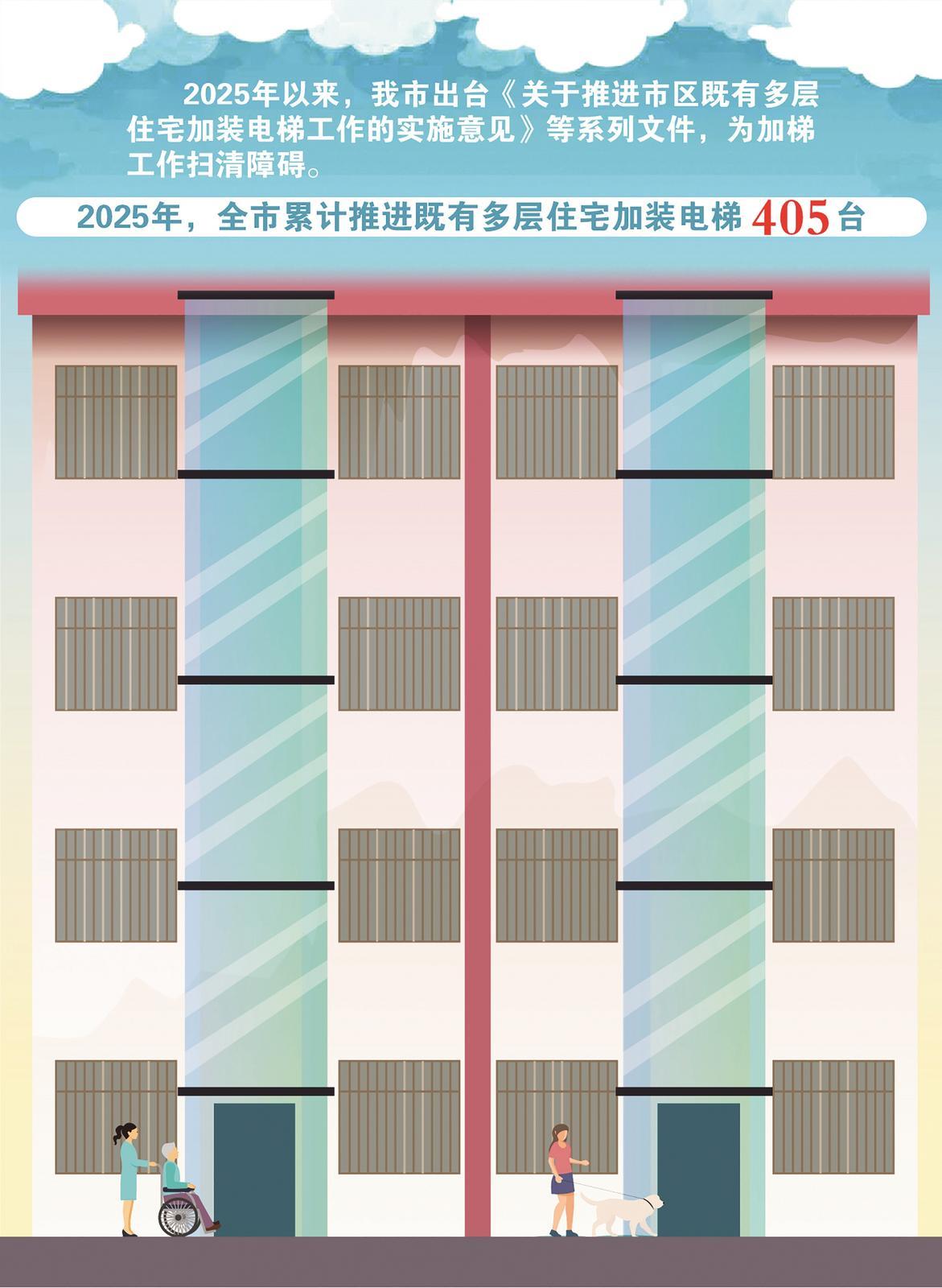 市物管中心副主任杨逸介绍,2025年以来,南通市聚焦既有多层住宅加装电梯“意愿统一难、资金筹措难、后期运维难”等痛点,持续优化政策供给,出台《关于推进市区既有多层住宅加装电梯工作的实施意见》等系列文件,通过建立联合审查机制简化审批流程、提高财政补贴标准、设立专项维修资金等举措,为加梯工作扫清障碍。2025年,全市累计推进既有多层住宅加装电梯405台,让更多市民告别“爬楼难”,拥抱“垂直便利”。