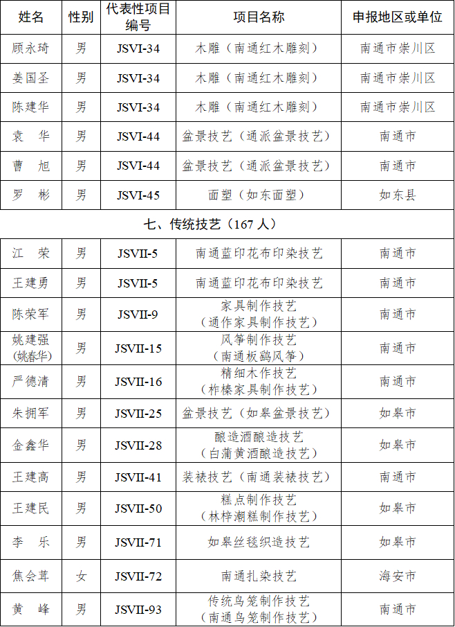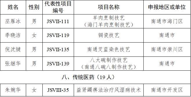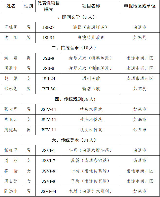 近日,江苏省文化和旅游厅正式公布第六批江苏省非物质文化遗产代表性传承人名单,南通市37位传承人成功入选,涵盖了民间文学、传统音乐、传统戏剧、传统美术、传统技艺、传统医药六大类别。至此,我市省级以上非物质文化遗产代表性传承人总数达84名。