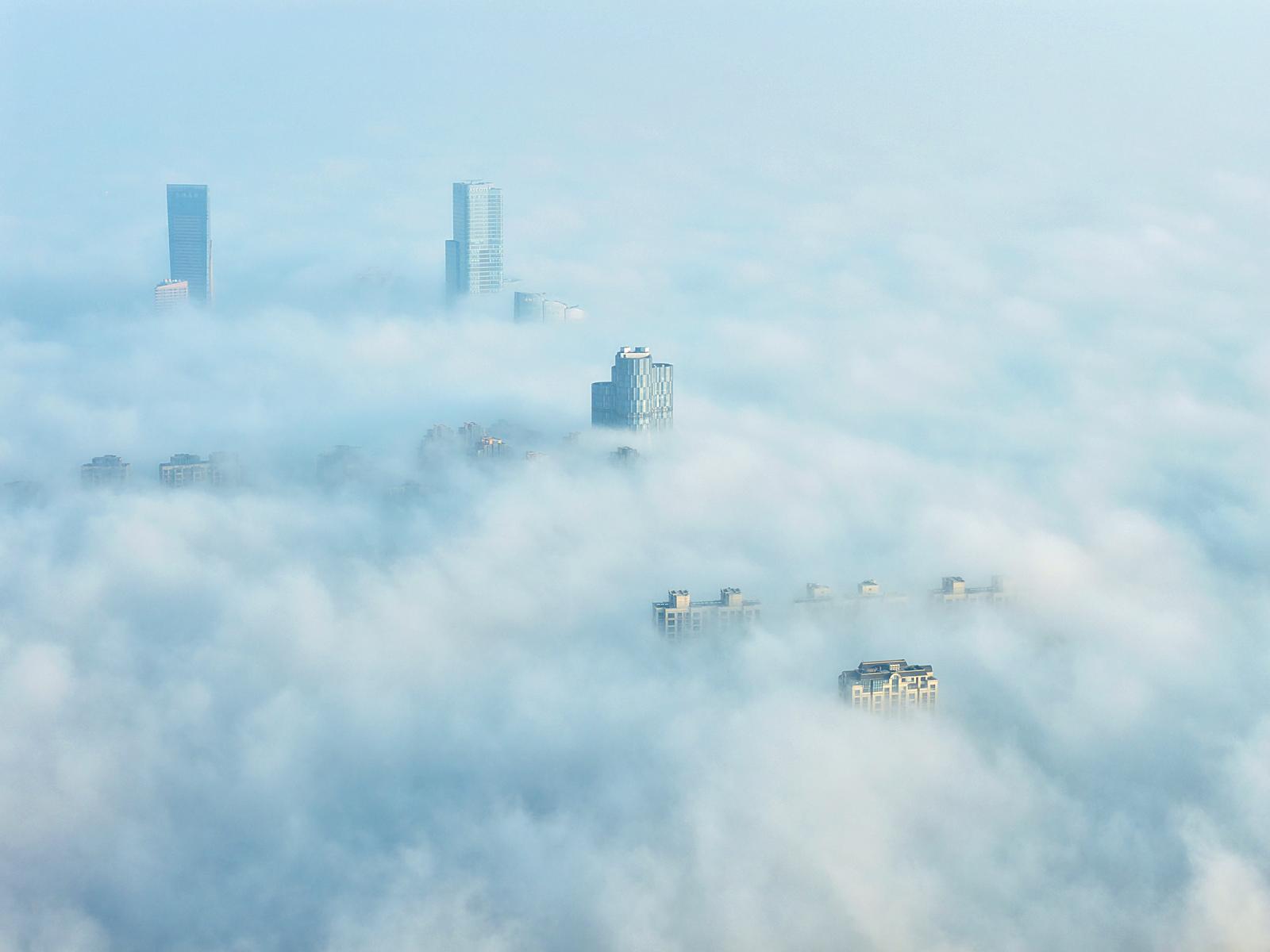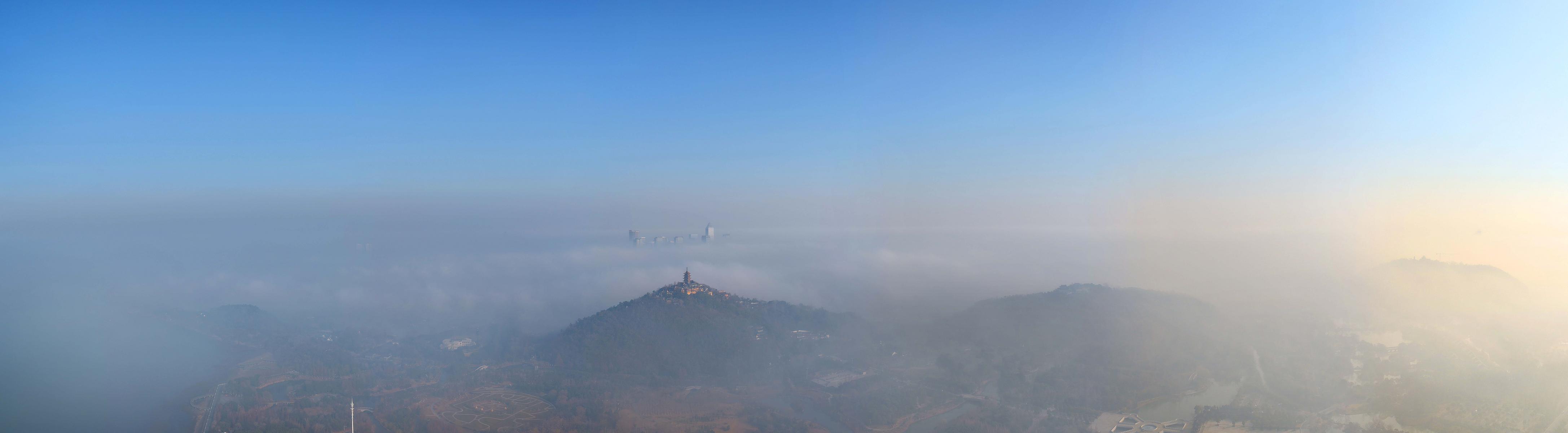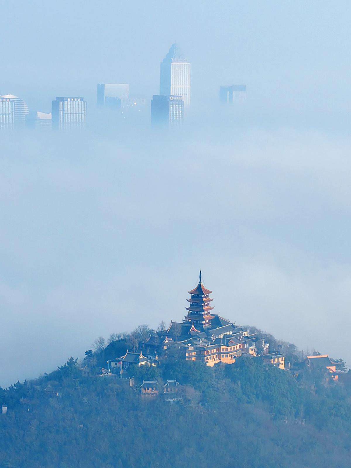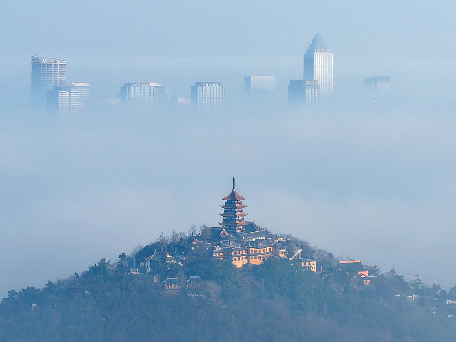 2026年1月16日,晨雾中的南通狼山国家森林公园和南通新城区高楼展现出别样美景。