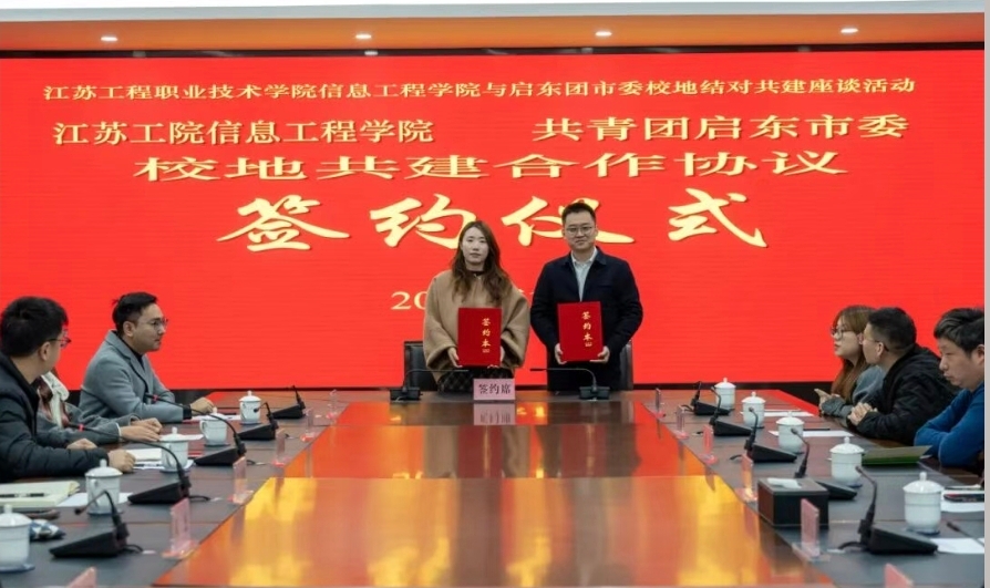 为加强校地合作,促进资源共享与优势互补,加强青年人才就业帮扶,共同探索人才培养新模式,推动地方经济发展与产业升级,1月16日,江苏工程职业技术学院信息工程学院与启东团市委签订了校地共建合作协议,与启东青商会多家企业签订了《就业基地合作协议》。