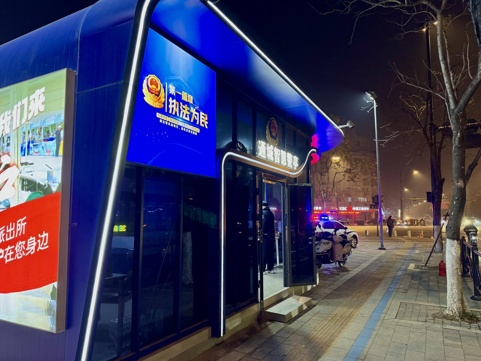 16日晚8时,市区濠西路濠北路路口西北角,一个科技范十足的街边岗亭警灯闪烁。亭内,多块大屏实时呈现辖区动态,4名警力正专注值守。亭外,警车随时待命,确保警情一来,即刻出动。