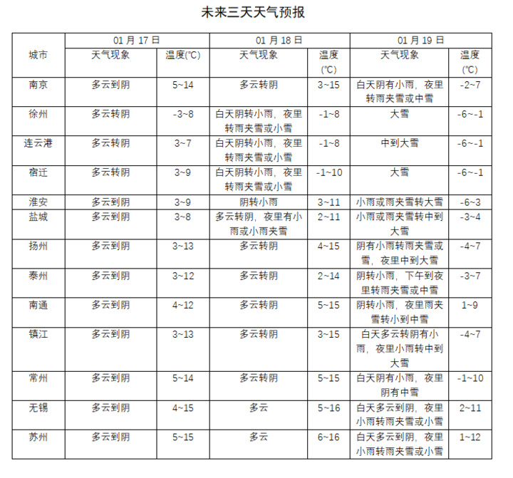 1月17日至19日,江苏省举行普通高中学业水平合格性考试(笔试),考试期间的天气因素是广大家长与考生关注的焦点。根据江苏省气象局相关信息,18日夜里至19日江苏将有寒潮、大风和雨雪天气。为了方便家长和考生安排行程,记者将考试三天江苏各地的天气情况梳理如下,以供参考。