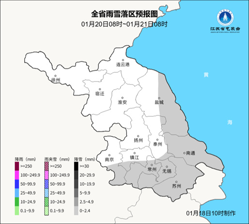 具体来看,1月18日08时至1月19日08时,今天白天到夜里,白天淮北地区多云转阴有小雨,其他地区多云到阴;夜里沿淮和淮北地区阴有小雨转小雨夹雪或小雪,本省东南部地区多云到阴,其他地区阴有小雨。今天最高温度:苏南地区15℃左右,沿淮和淮北地区8~9℃,其他地区12~13℃;明晨最低温度:淮北地区-2~-3℃,沿江和苏南地区5℃左右,其他地区2~3℃。全省东到东北风4-5级,夜里逐渐增强为5级阵风6-7级。