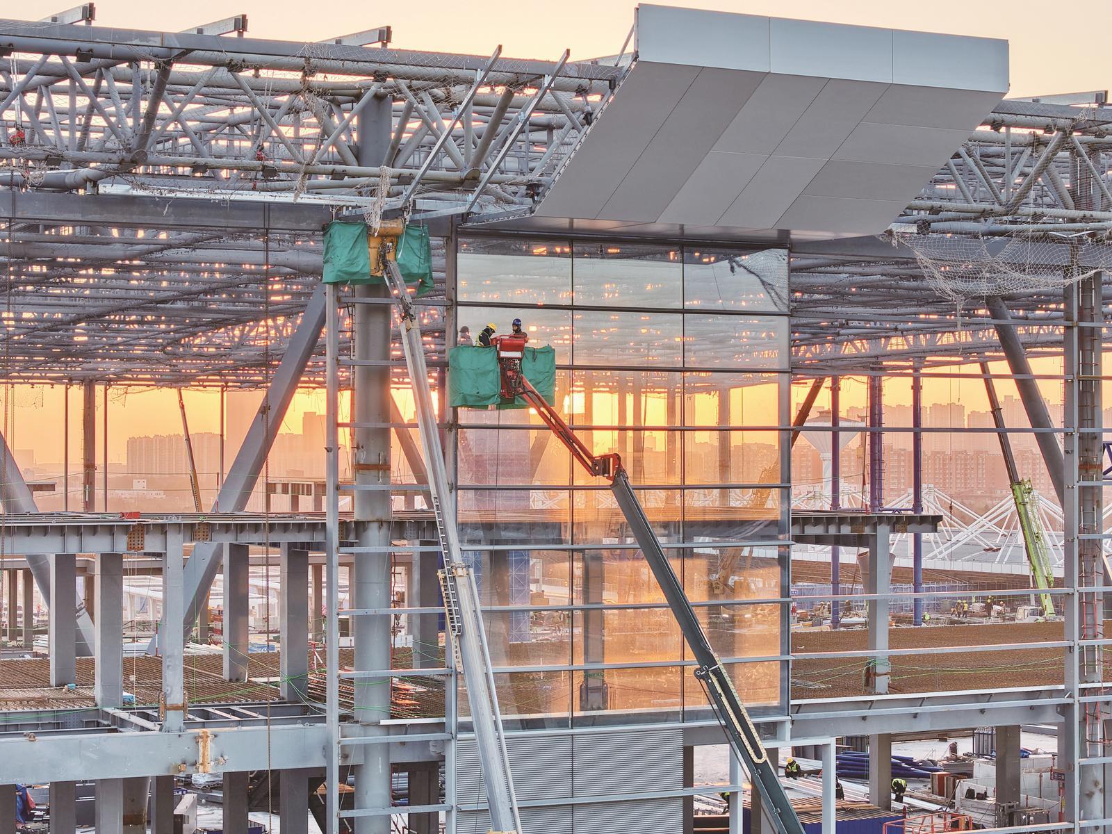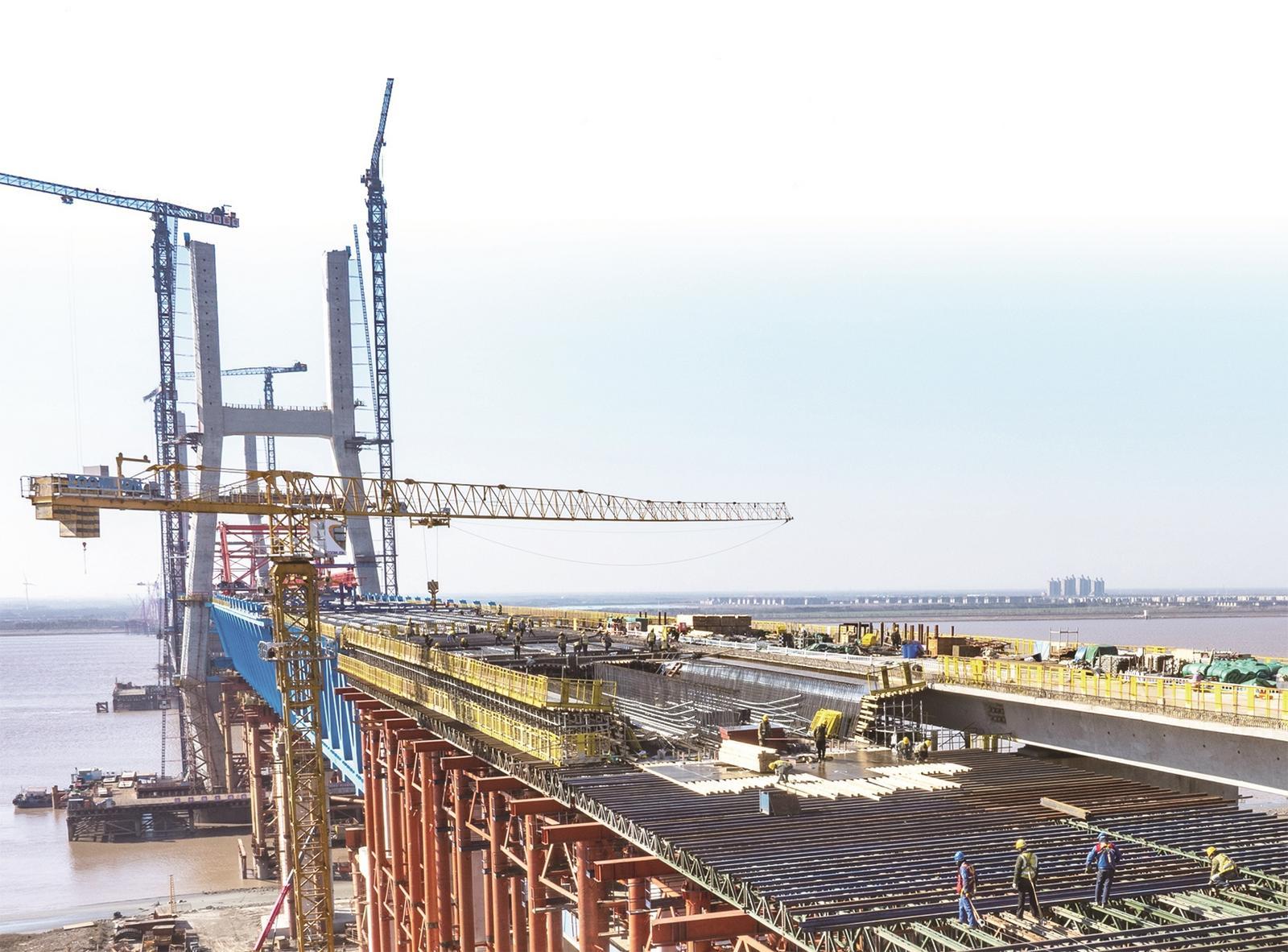 1月11日,工人们在搭建崇启公铁长江大桥上层公路桥面混凝土施工平台。 季青春摄
