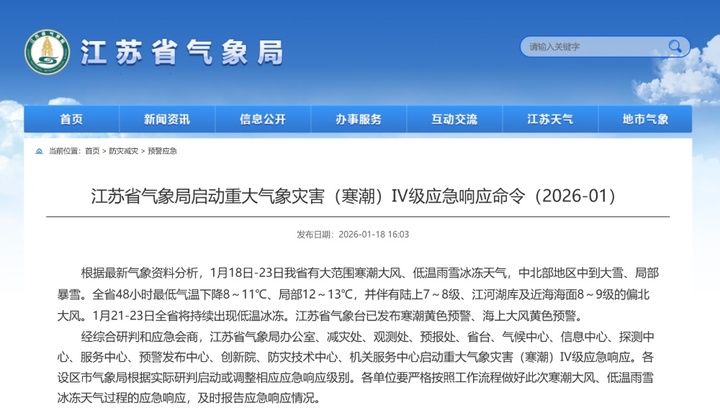1月18日夜间起,强冷空气裹挟雨雪席卷江苏,徐州、宿迁、淮安等6市陆续出现小到中雪,最大积雪深度达3厘米,本轮寒潮成为今年以来最强天气过程。面对严峻形势,江苏省气象部门迅速行动、多措并举筑牢防灾减灾第一道防线。江苏省气象局应急与减灾处处长王平在接受记者采访时,详细介绍了全省气象部门应对雨雪冰冻天气的各项举措。