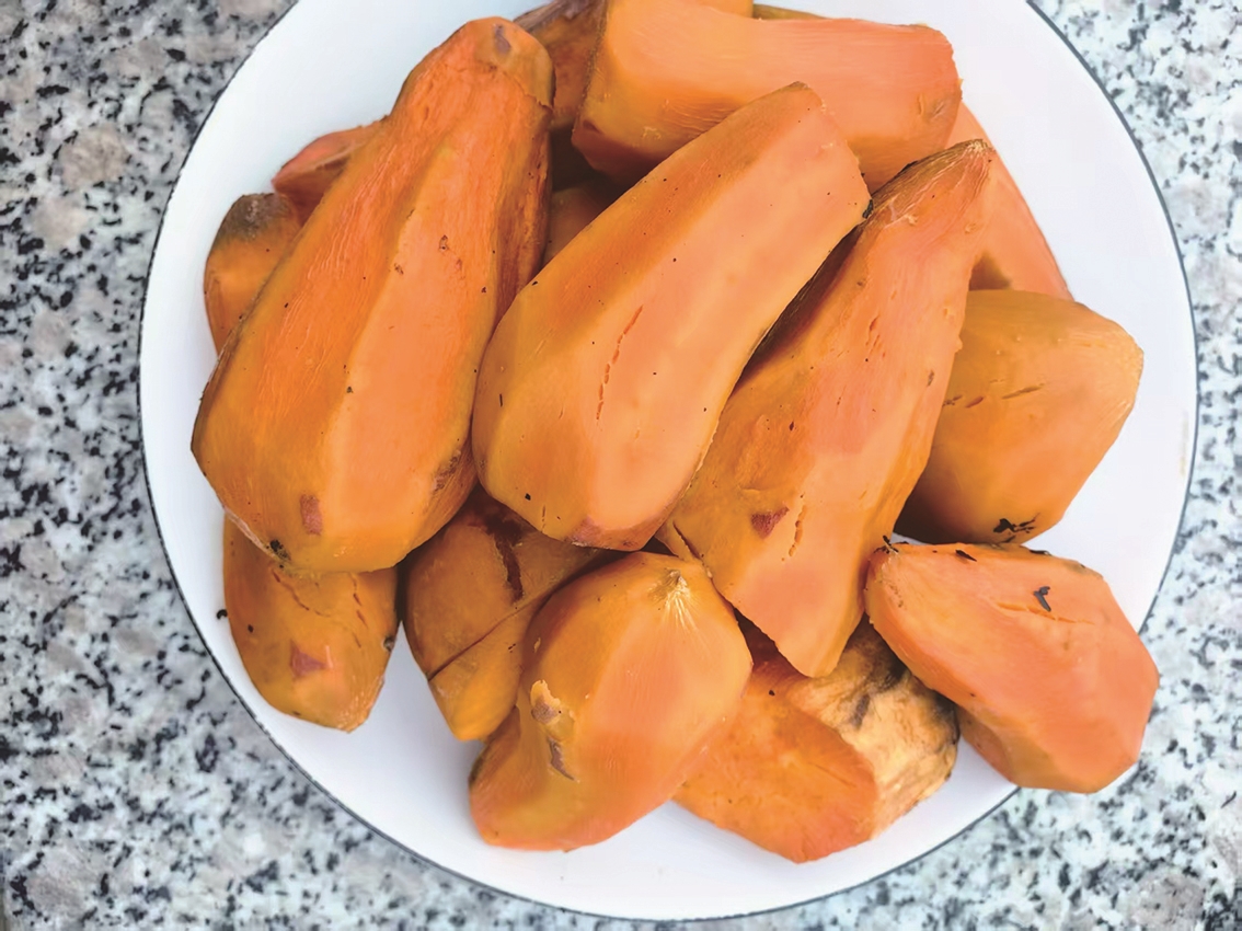 半小时后,我揭开锅盖,馥郁的甜香扑面而来,热气烫得我忙摘下眼镜。腾腾热气里,一个个红亮喷香的番芋静卧锅中,惹得我口水直流。用筷子一戳,便裂开了小口。装盘上桌,我和妻子各抓一个,咬下一口,软糯果肉在舌尖化开,满口香甜。